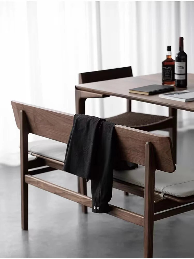 北米産ブラックウォールナットのダイニングチェア|和風デザインの一体型背もたれ付きロングベンチ|家庭用の高品質無垢材製|リラックスできる居心地の良い椅子