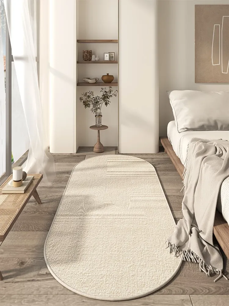 エレガントなオーバル型イタリアンミニマルラグ - ベッドサイドやリビングに最適!侘び寂びの美を演出し、主寝室にぴったりなフォトジェニックなマット。心地よい空間を作り出す必需品!