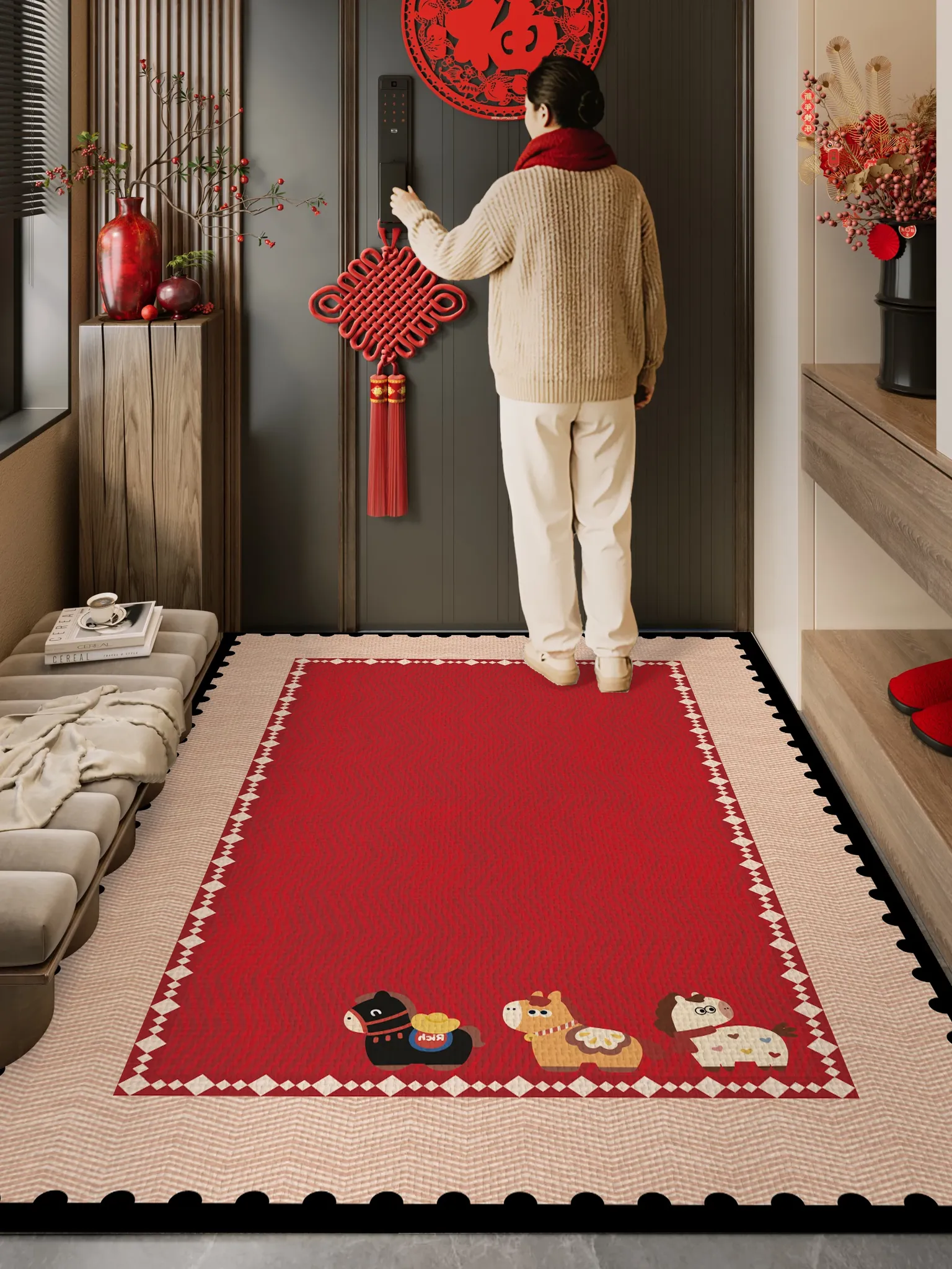 馬年の玄関マット|縦型デザインのカーペット|赤色でお祝いムード満点!新年の訪問客を迎えるための理想的な靴脱ぎエリアマット|廊下や通路にもぴったり!