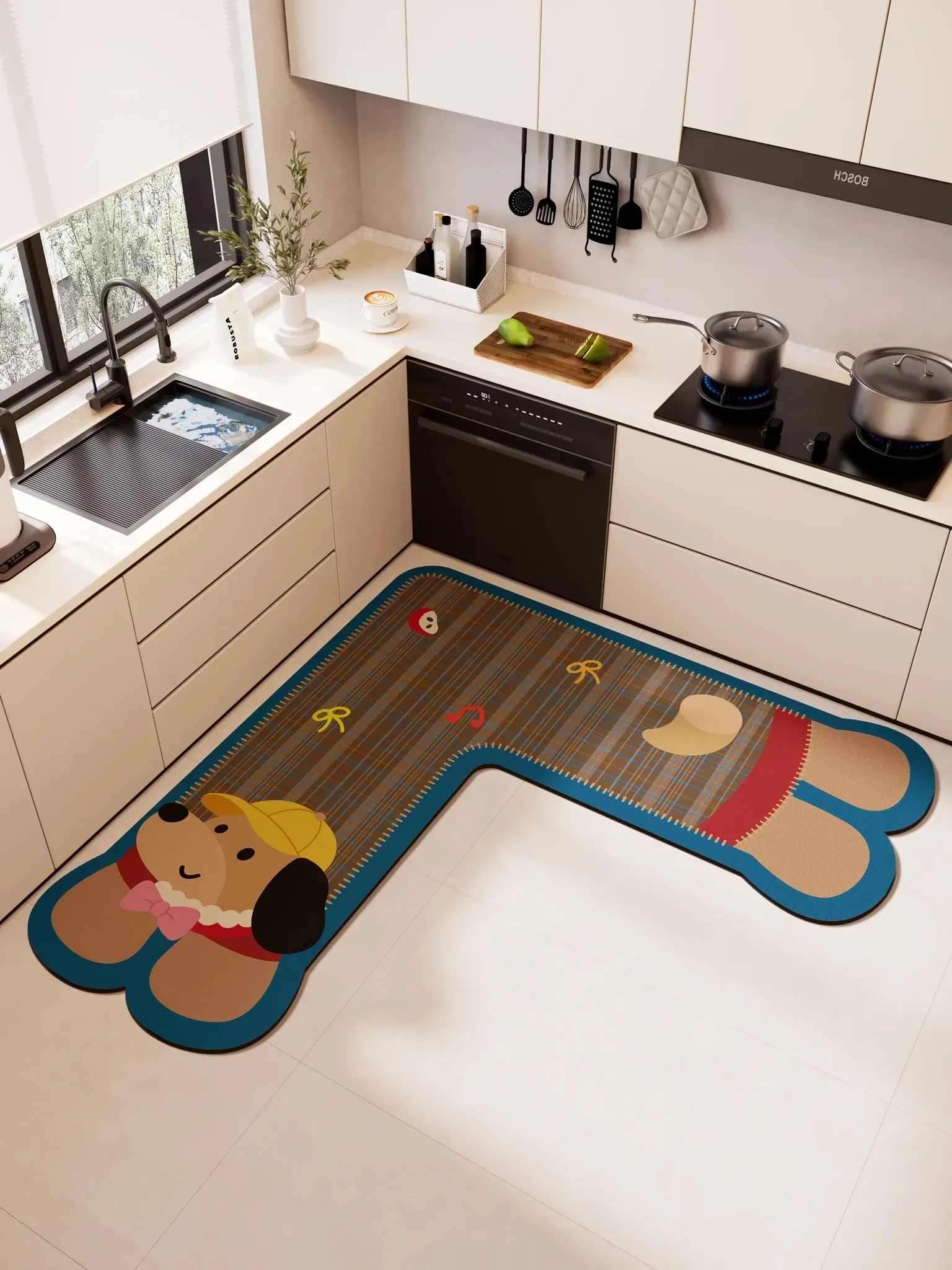 L型キッチンマット・吸水速乾・耐汚れ・滑り止め・かわいいカートゥーンデザイン・おしゃれな形状のコーナー用フットマット!おしゃれで実用的、毎日の料理を楽しくサポートします!