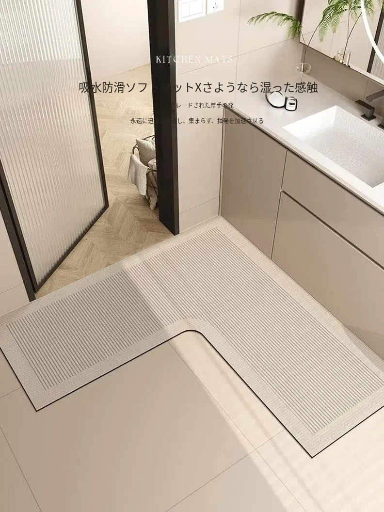 L型バスルームマット - 吸水性抜群で滑り止め効果も!トイレや洗面所の入り口に最適な柔らかいコーナーマット。清潔感あふれるデザインで、快適なバスタイムを演出します!