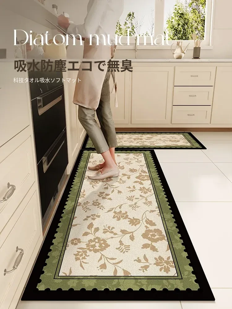 高級感あふれるアメリカンスタイルのグリーンキッチンマット!滑り止め&防油仕様で、汚れに強い!吸水性抜群の珪藻土素材で、掃除いらずの便利なラグです。あなたのキッチンをスタイリッシュに演出します!