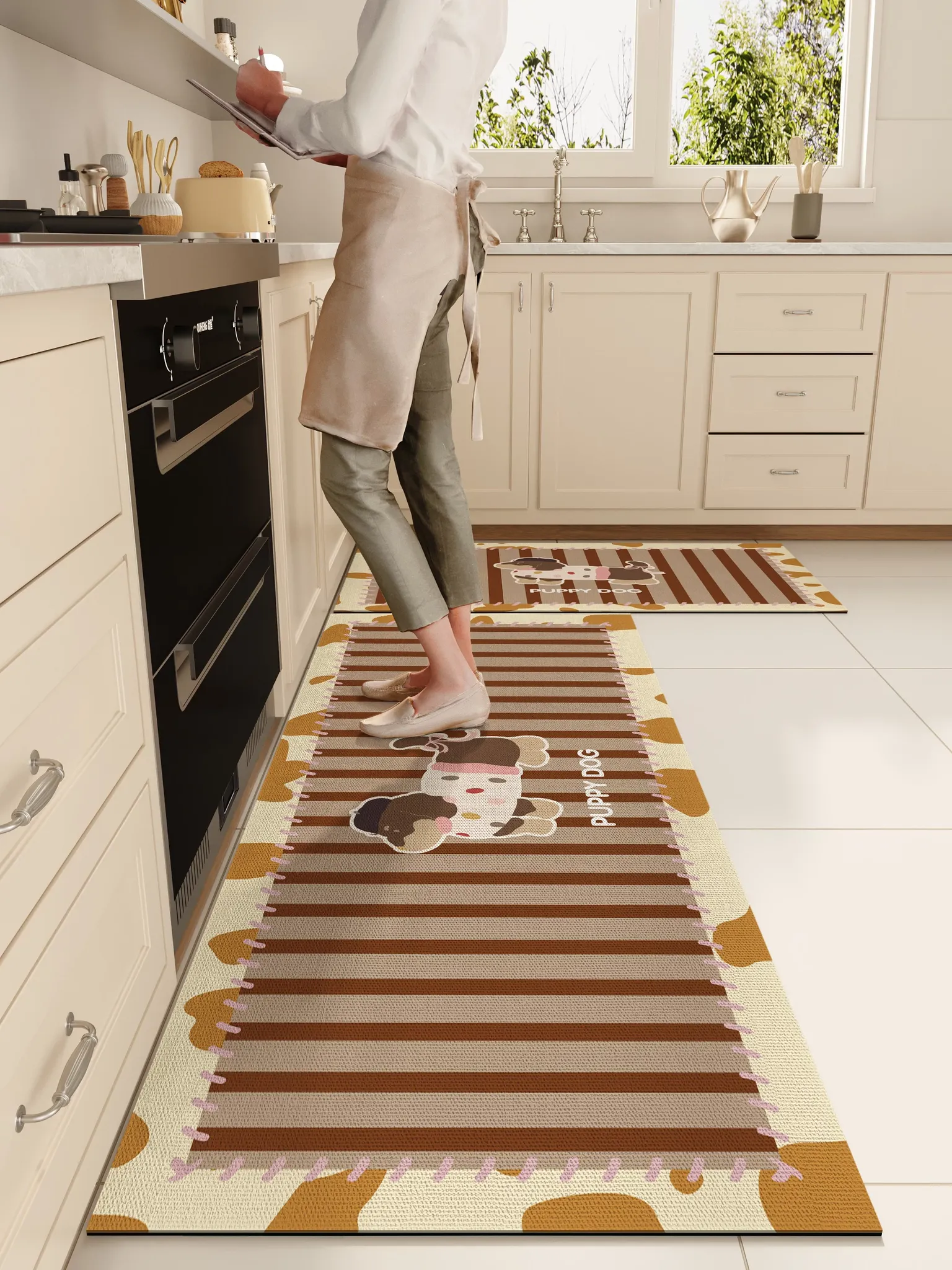 かわいい犬のデザインのキッチンマット!滑り止め・防油・洗濯不要・防水・汚れに強い、家庭用カット可能なフロアラグ。おしゃれで機能的なインテリアアイテムをぜひお試しください!