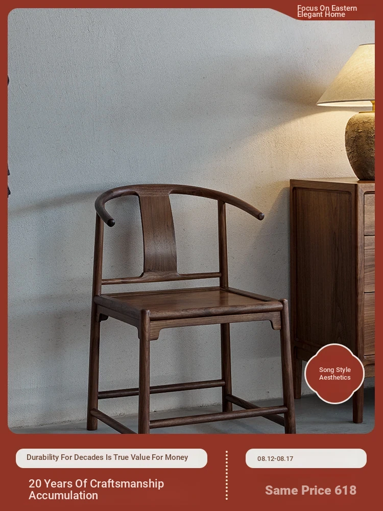 Pu Mu New Chinese Style Black Walnut Solid Wood Dining Chair - Horn Chair with Backrest, Minimalist Makeup Chair for Home Use