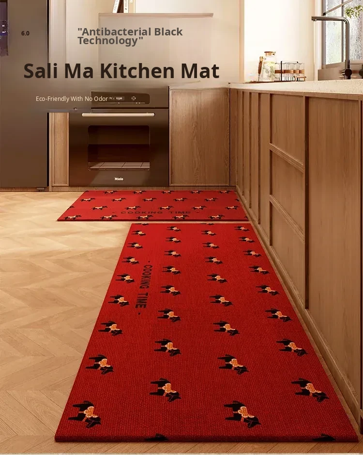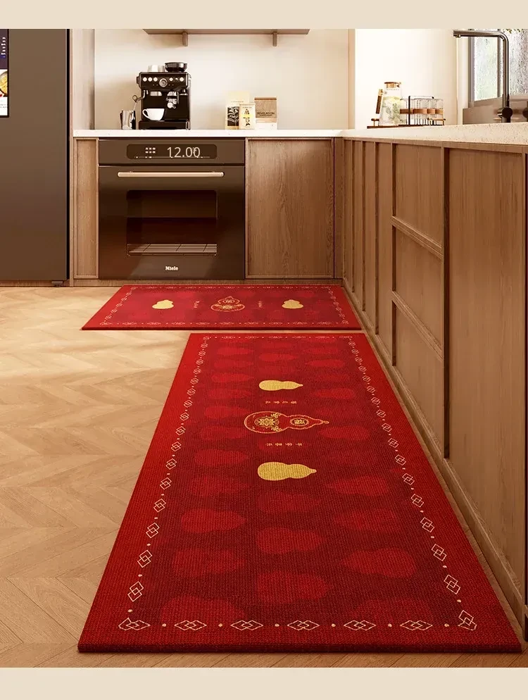 Premium Red New Year Kitchen Mat - Elegant Minimalist Design, Sari Fabric, Super Absorbent, Non-Slip, Oil-Resistant, Thick Woven Carpet for a Stylish Touch in Your Home