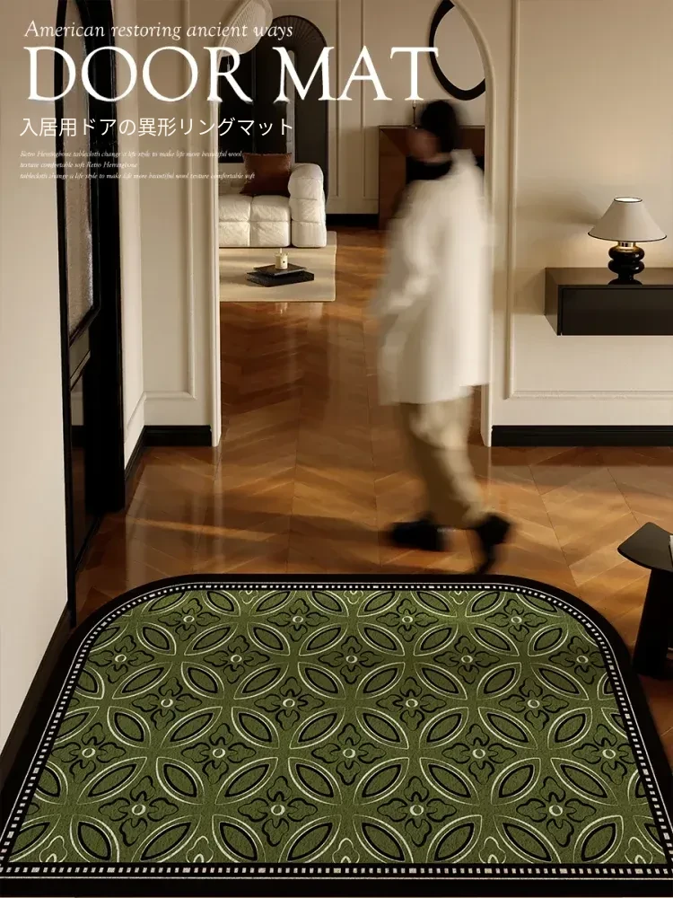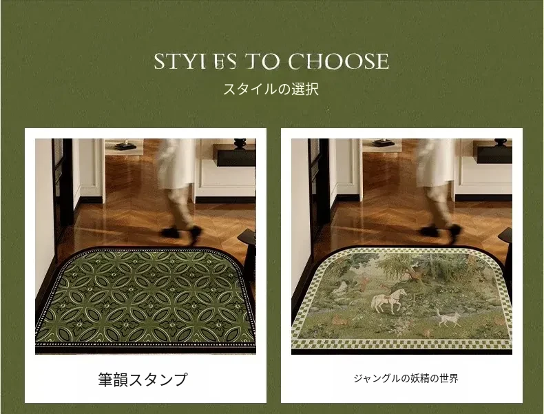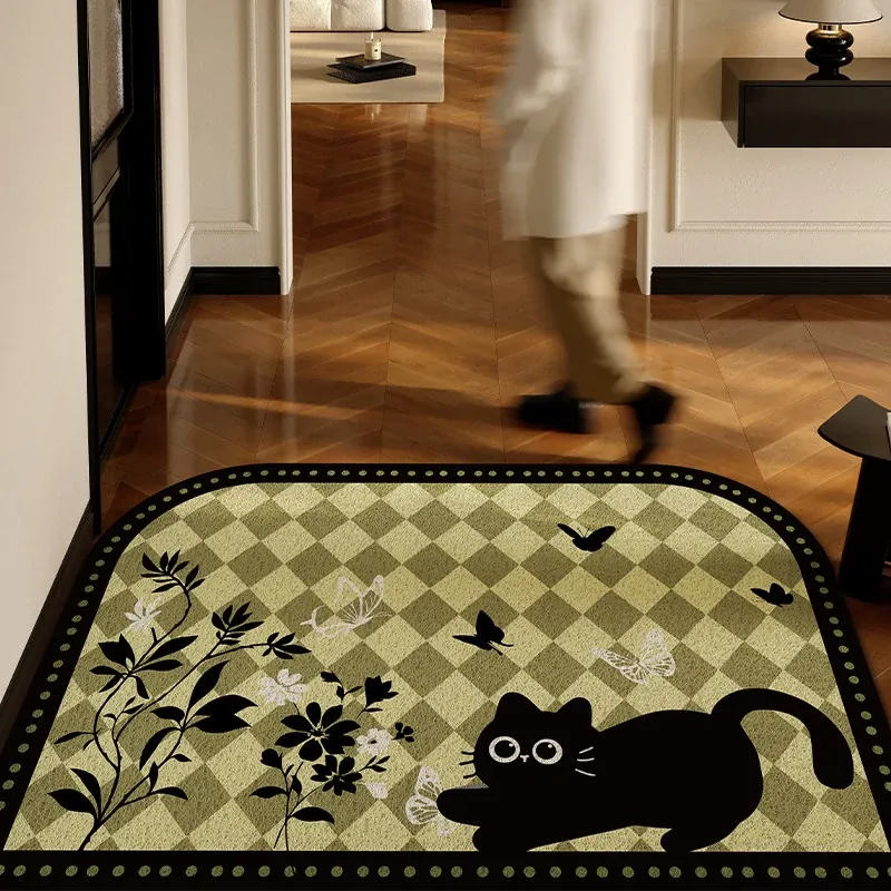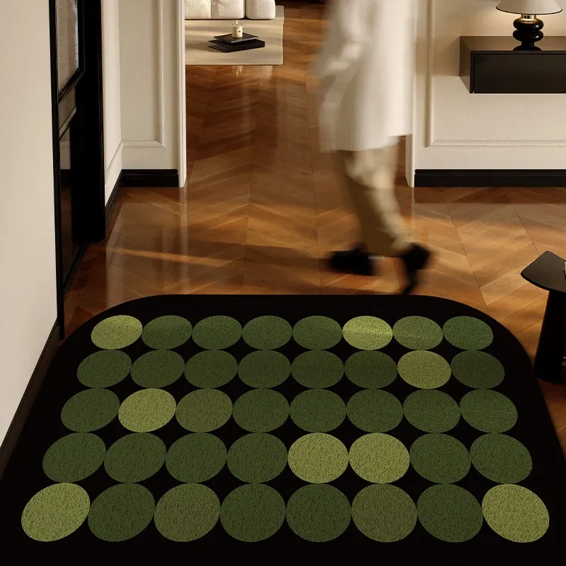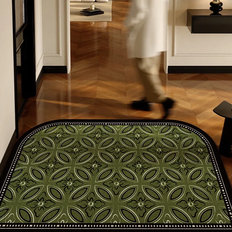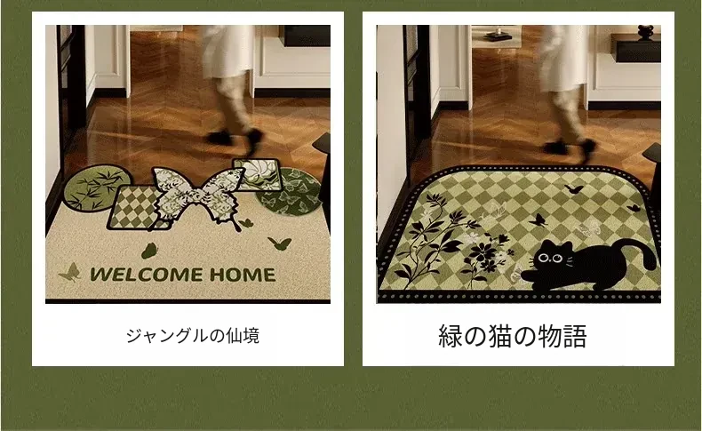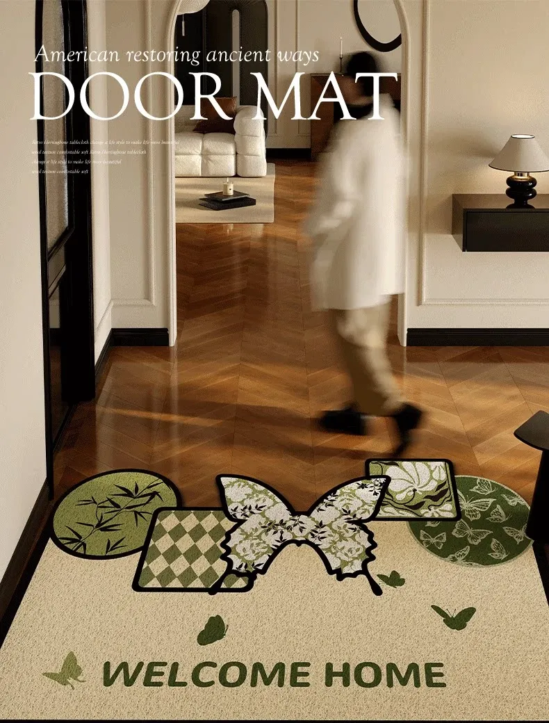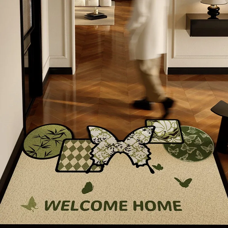 2025年新作!高級感溢れる軽奢スタイルの玄関マット - エレガントなグリーンのシルクループデザイン、蝶々モチーフのフロアカーペットでおもてなしの空間を演出!