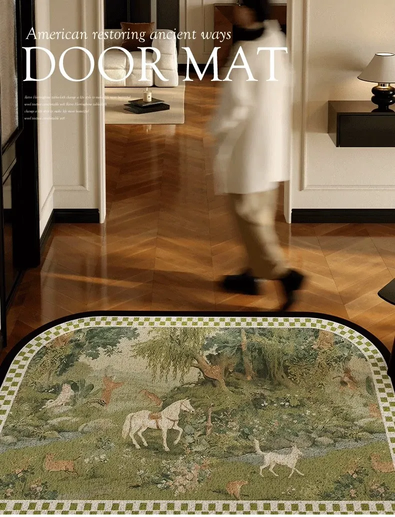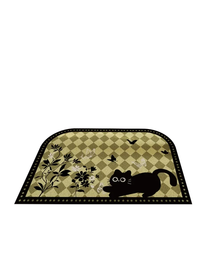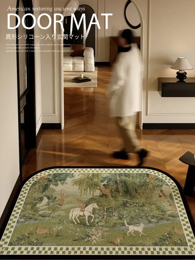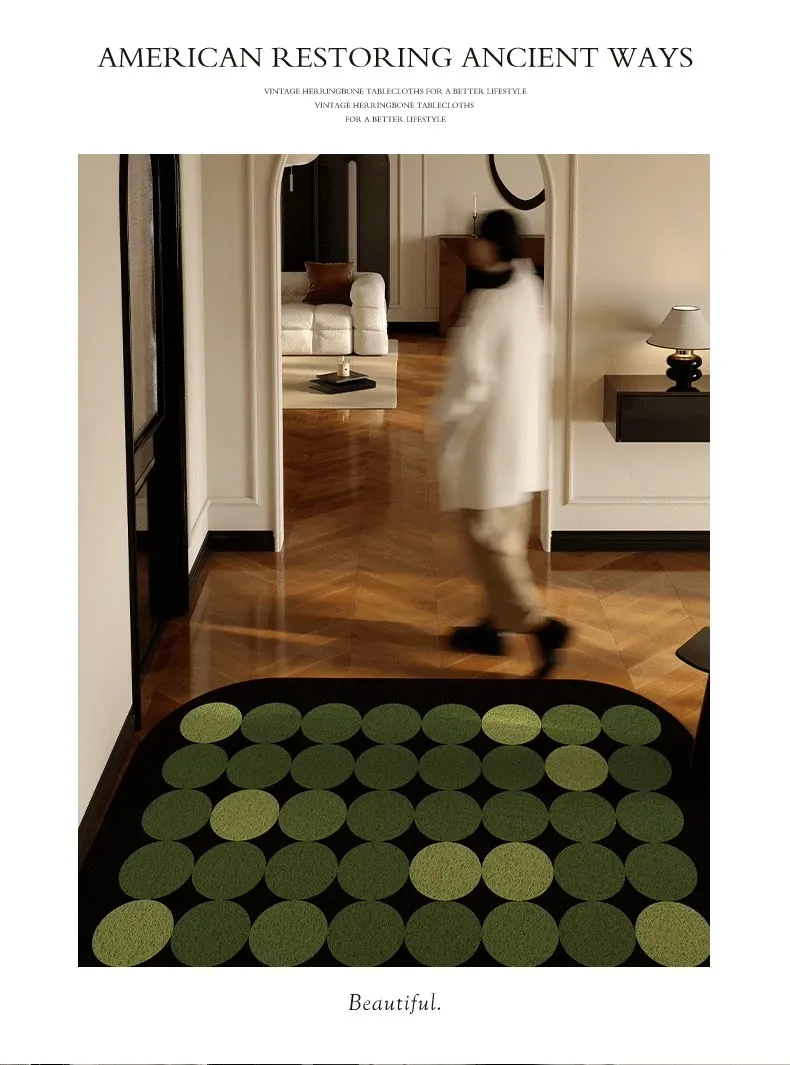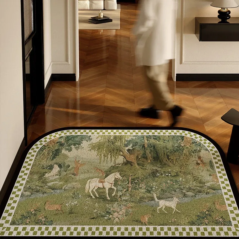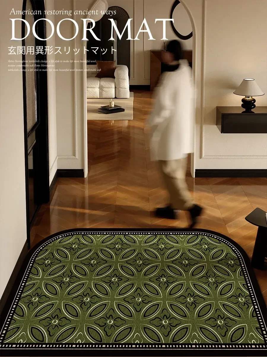 2025年新作!高級感溢れる軽奢スタイルの玄関マット - エレガントなグリーンのシルクループデザイン、蝶々モチーフのフロアカーペットでおもてなしの空間を演出!