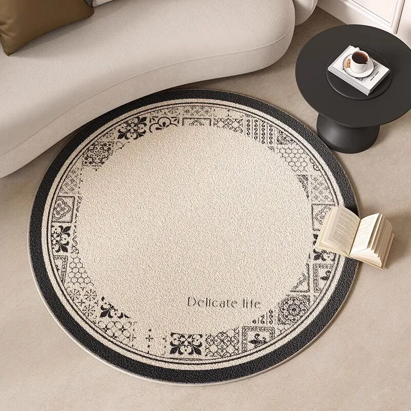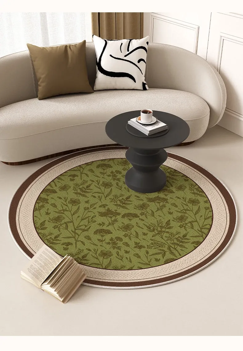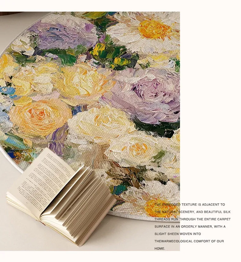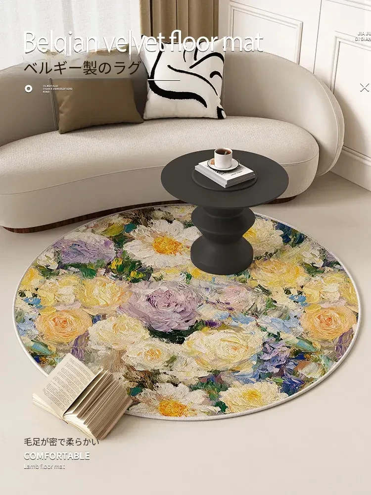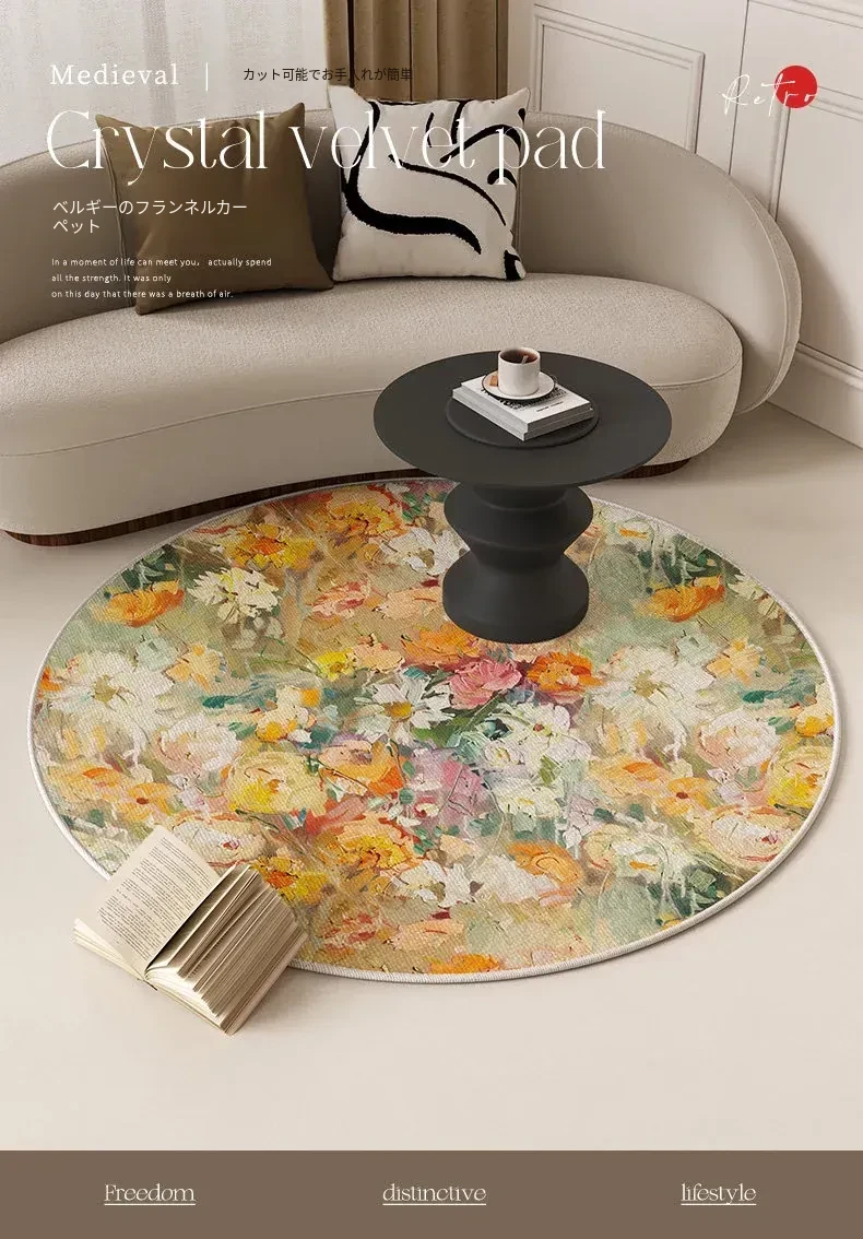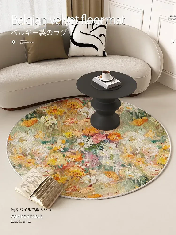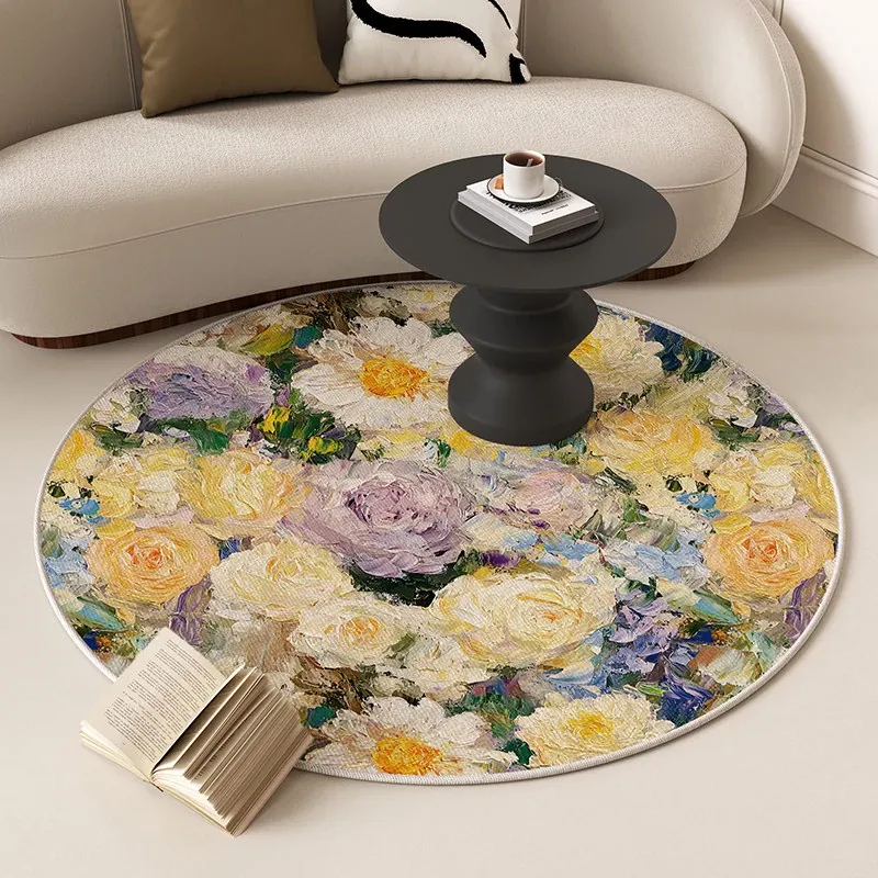 アメリカンオイルペイント風ラウンドカーペット - 防水・防汚機能付き、リビングルームやベッドサイドに最適な花柄マット!ソファやテーブルの下にぴったり、洗濯不要でお手入れ簡単!