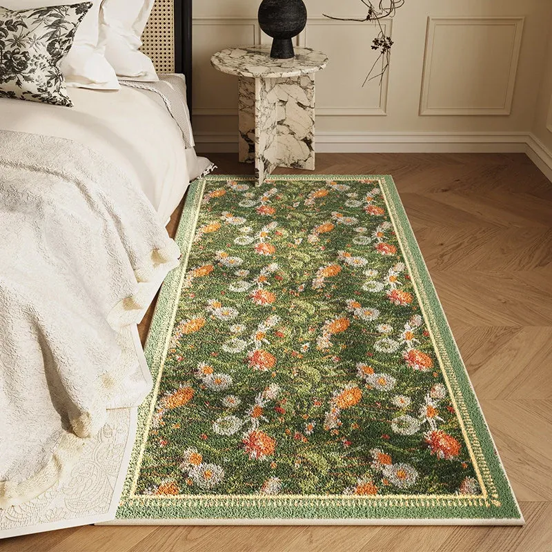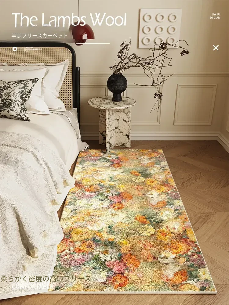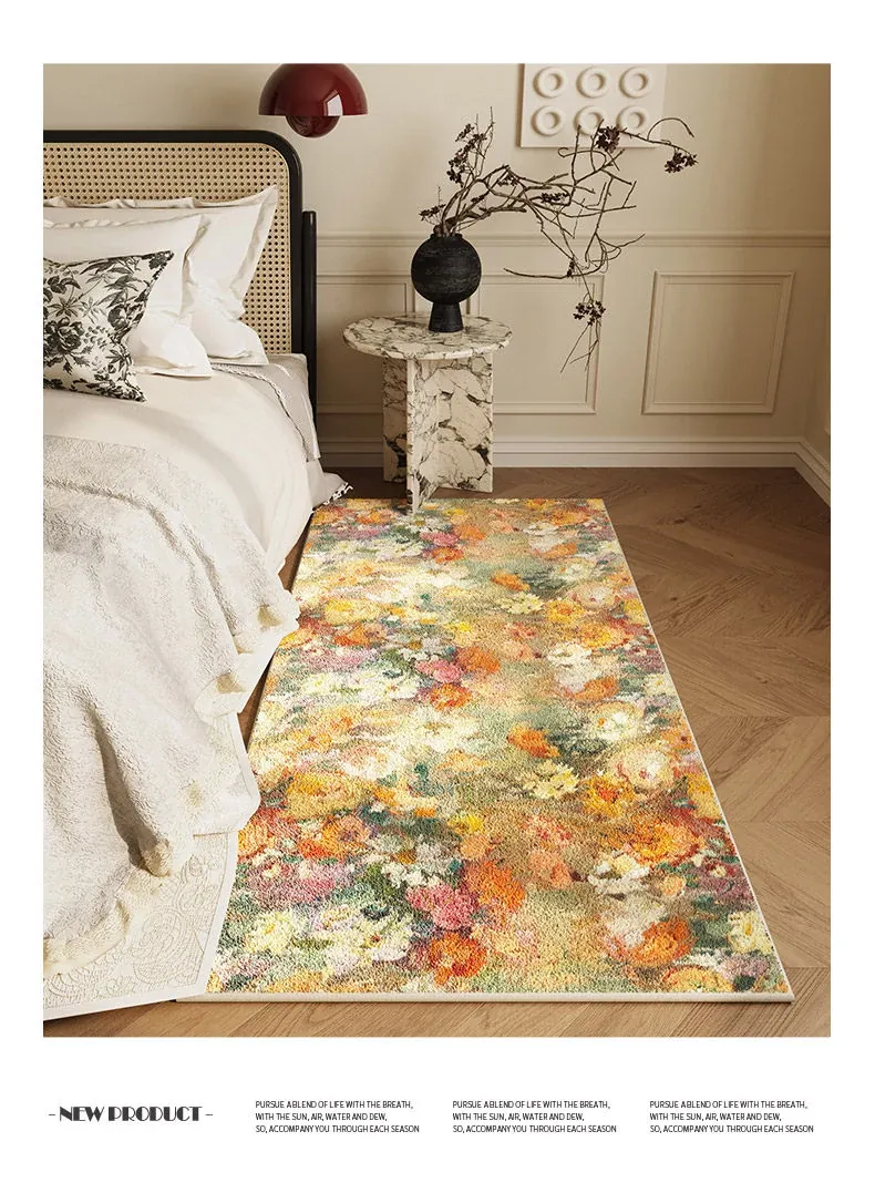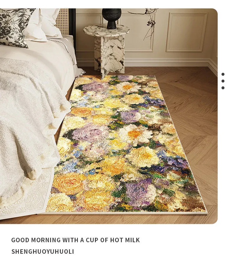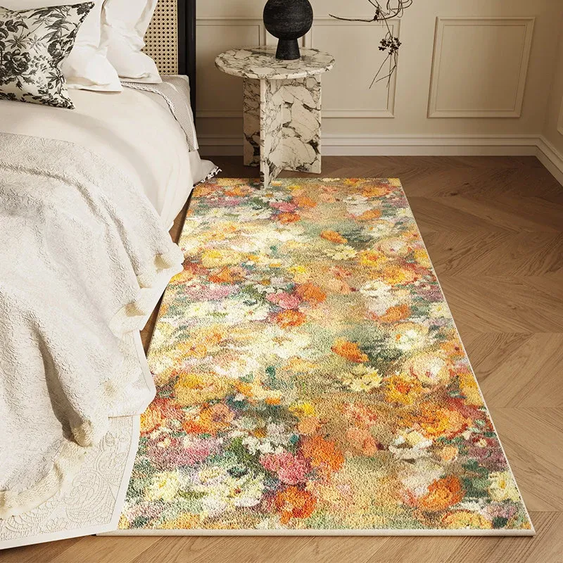 アメリカンレトロデザインのベッドサイドカーペット - 主寝室にぴったりのラグジュアリー感あふれる油絵風マット、洗濯不要でお手入れ簡単なフロアマット!