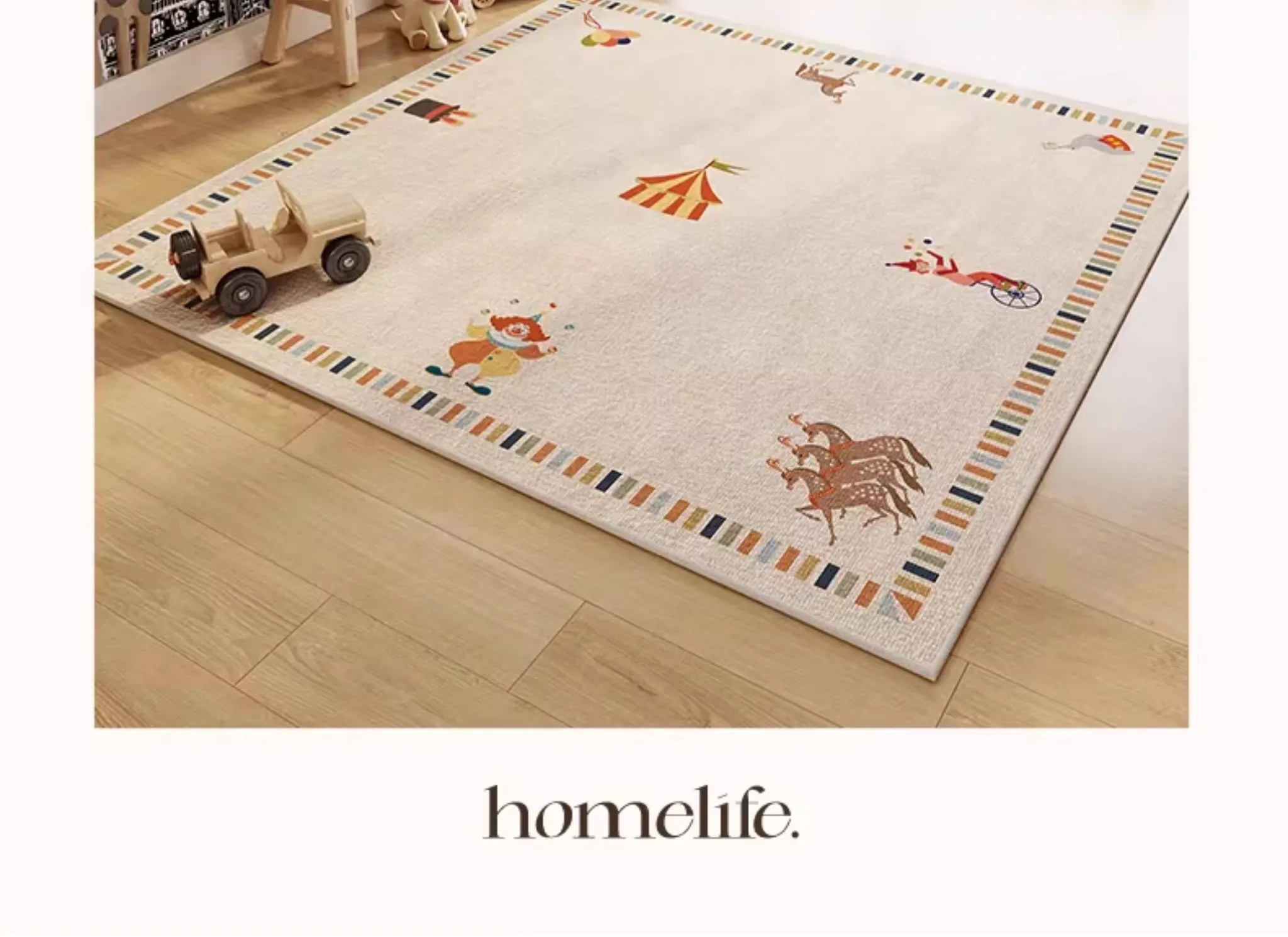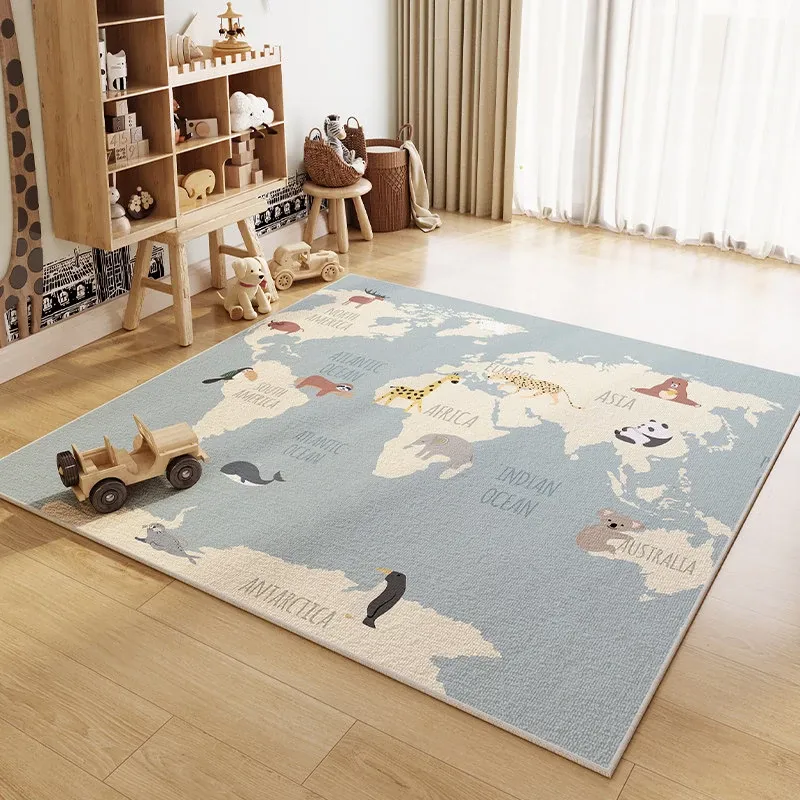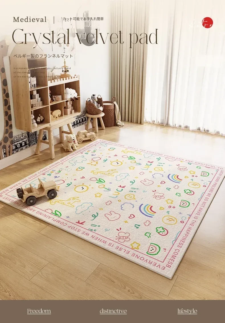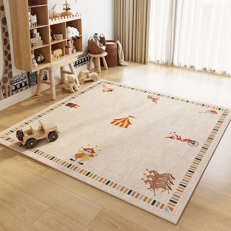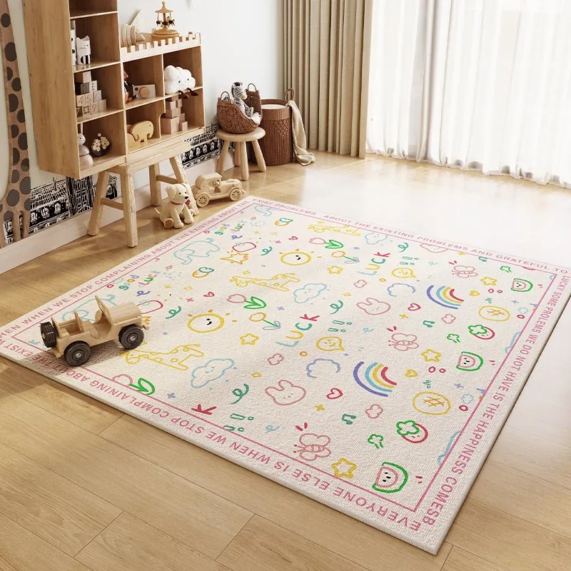 カラフルなキャラクター付き子供部屋用ラグ!リビングや書斎にもぴったりな正方形デザイン。赤ちゃんのハイハイや遊びに最適で、洗濯不要・手間いらずの便利なマットです。