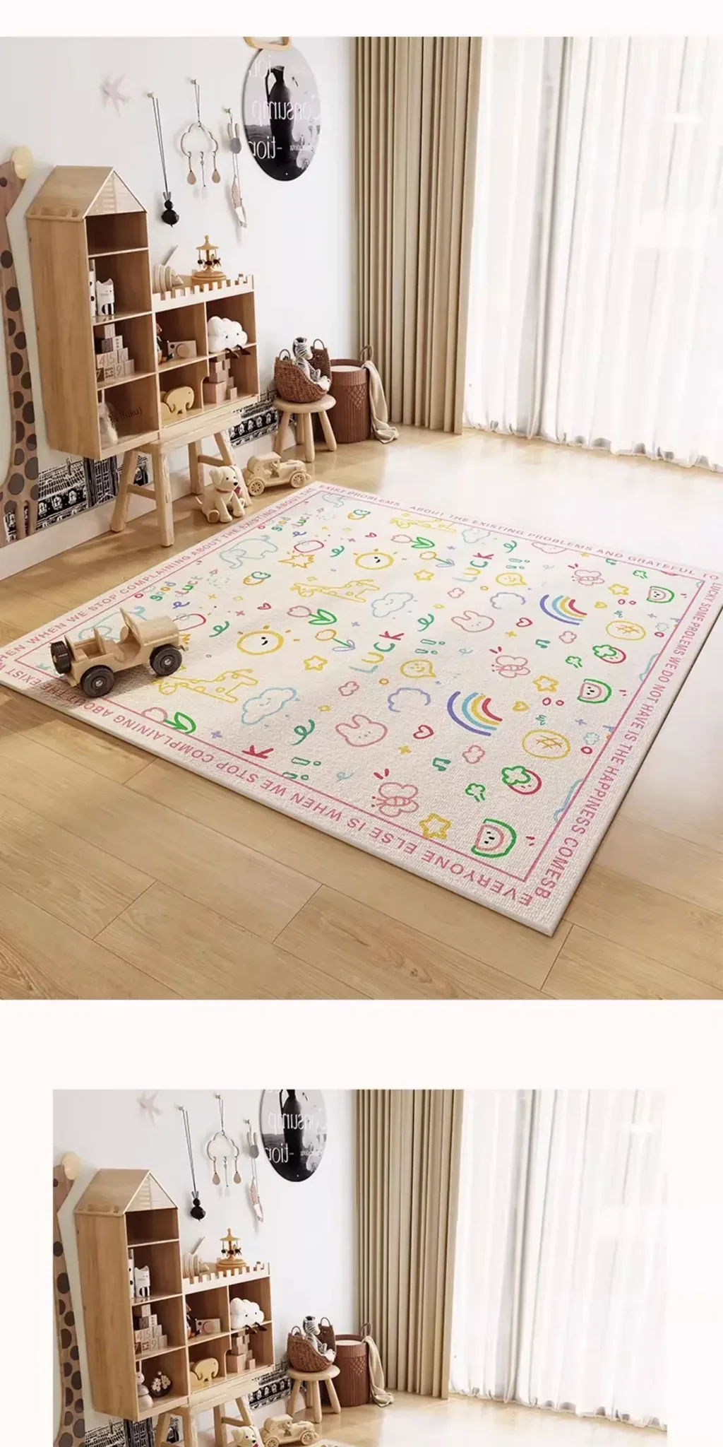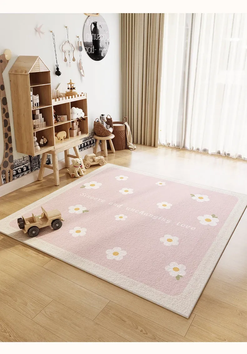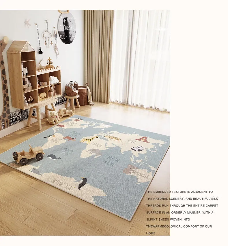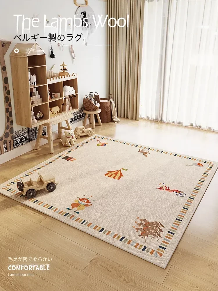 カラフルなキャラクター付き子供部屋用ラグ!リビングや書斎にもぴったりな正方形デザイン。赤ちゃんのハイハイや遊びに最適で、洗濯不要・手間いらずの便利なマットです。