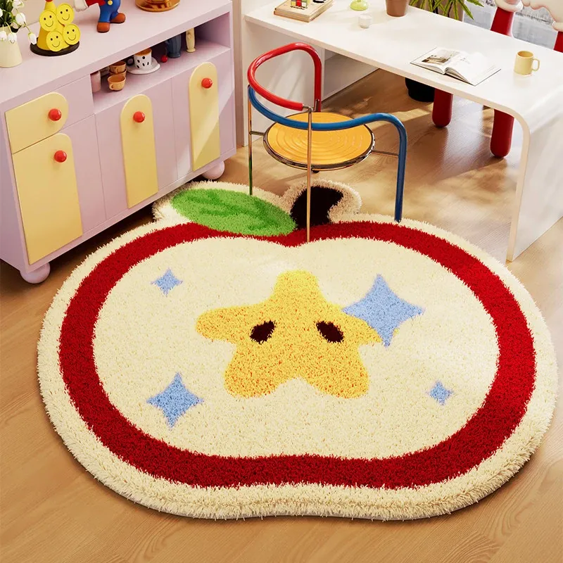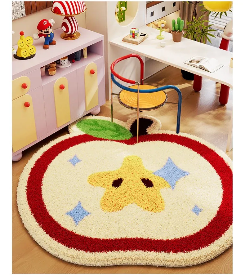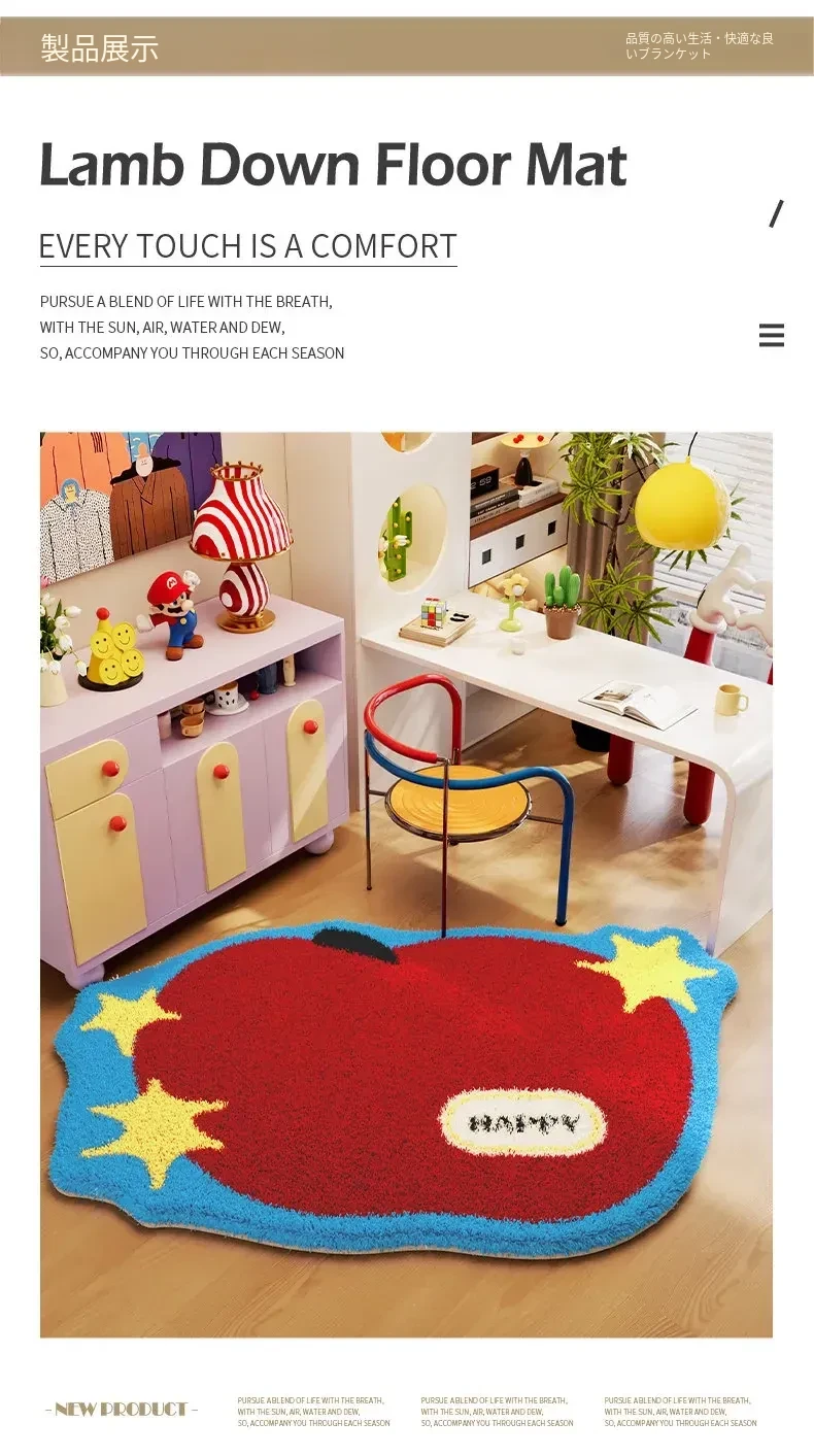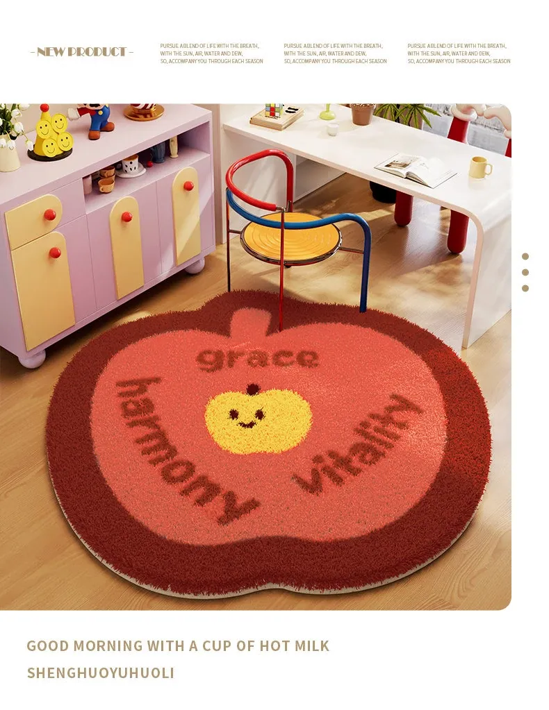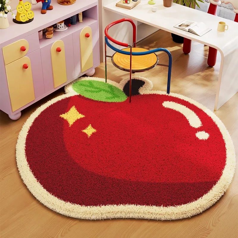 子供部屋にぴったり!かわいいアップル型のふわふわラグマット。読書や勉強に最適なデザイン、デスクや椅子の下でも大活躍!快適さと楽しさを兼ね備えた空間作りに最適です。