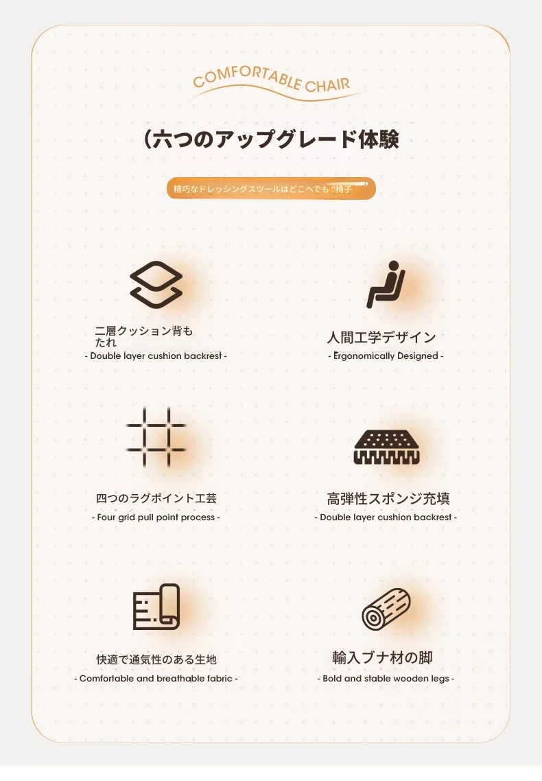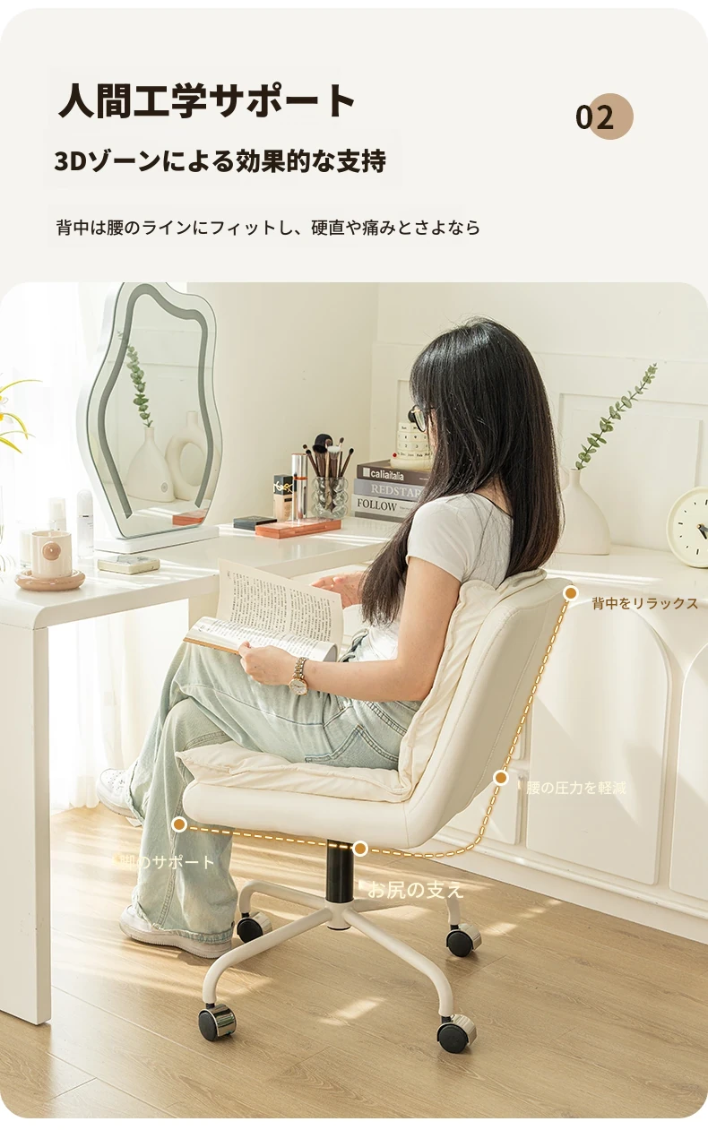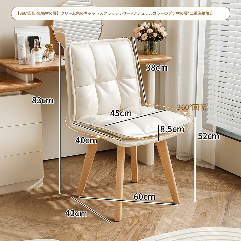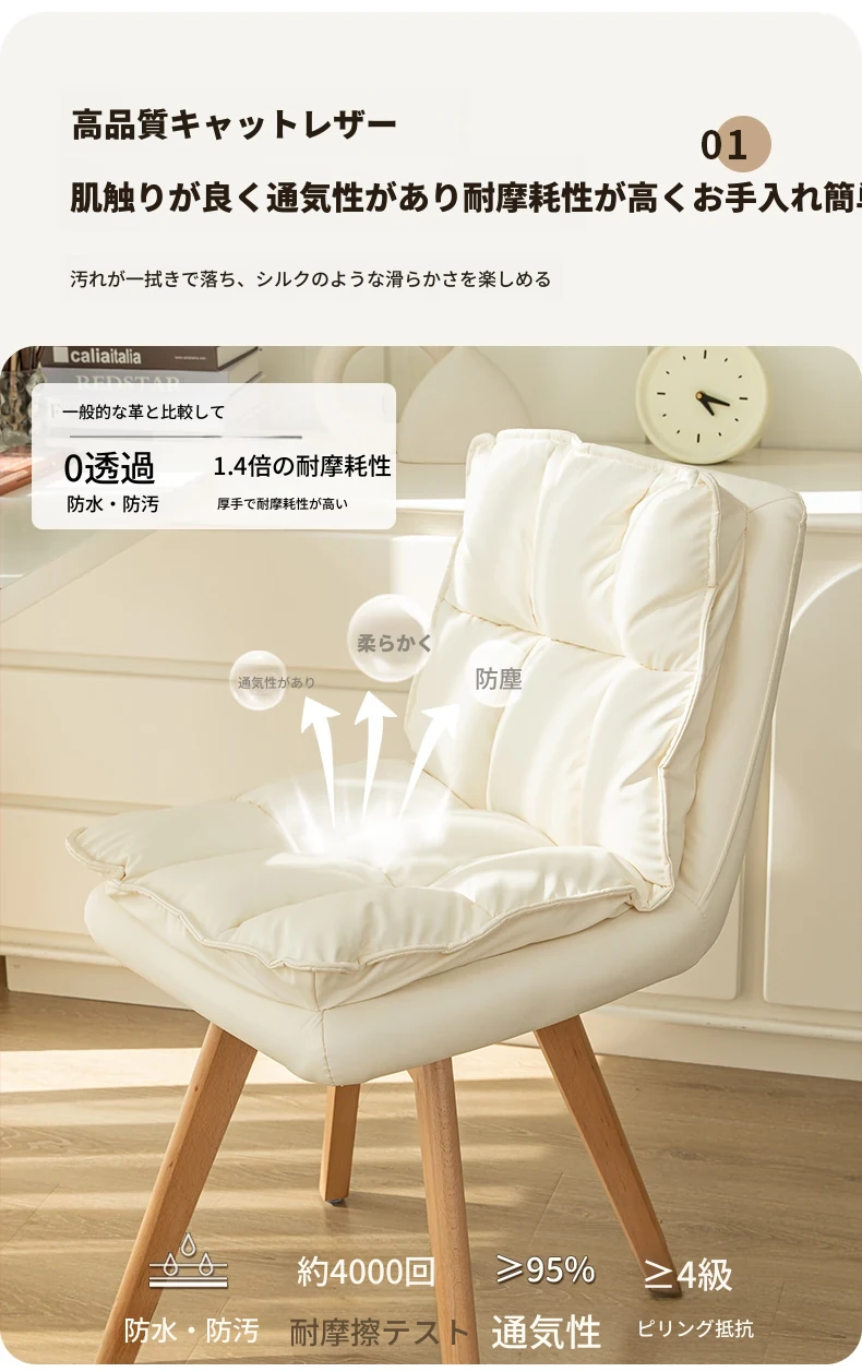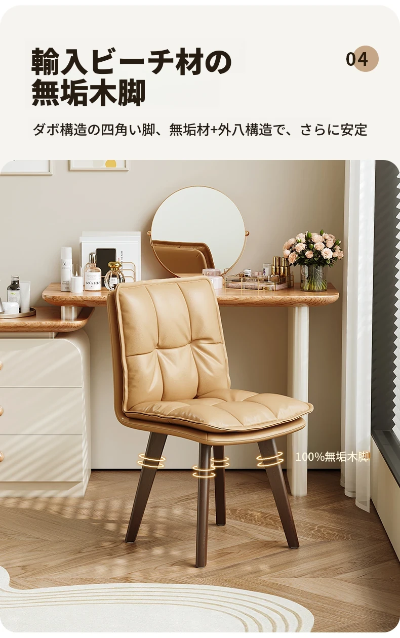 プレミアム化粧台用スツール|女の子のための快適な化粧椅子|クリーミーなデザインで、おしゃれな寝室を演出|背もたれ付きで長時間座っても疲れにくい!