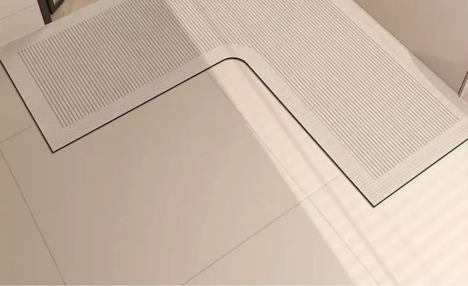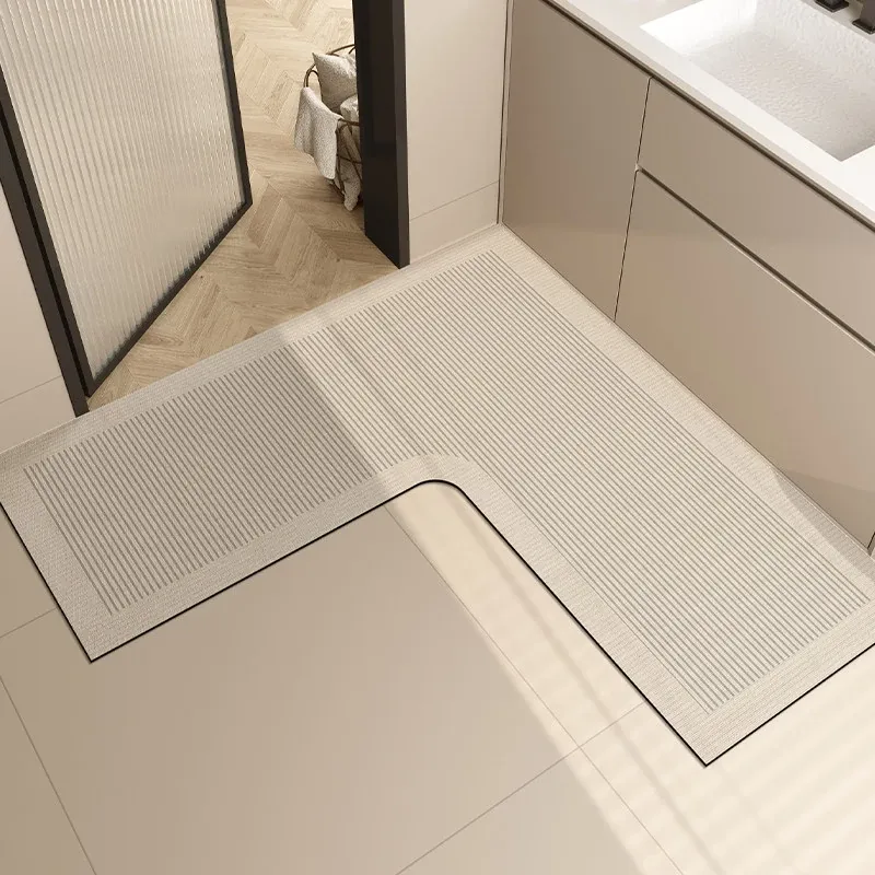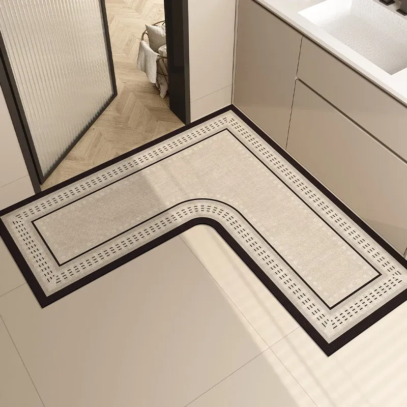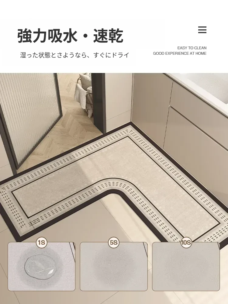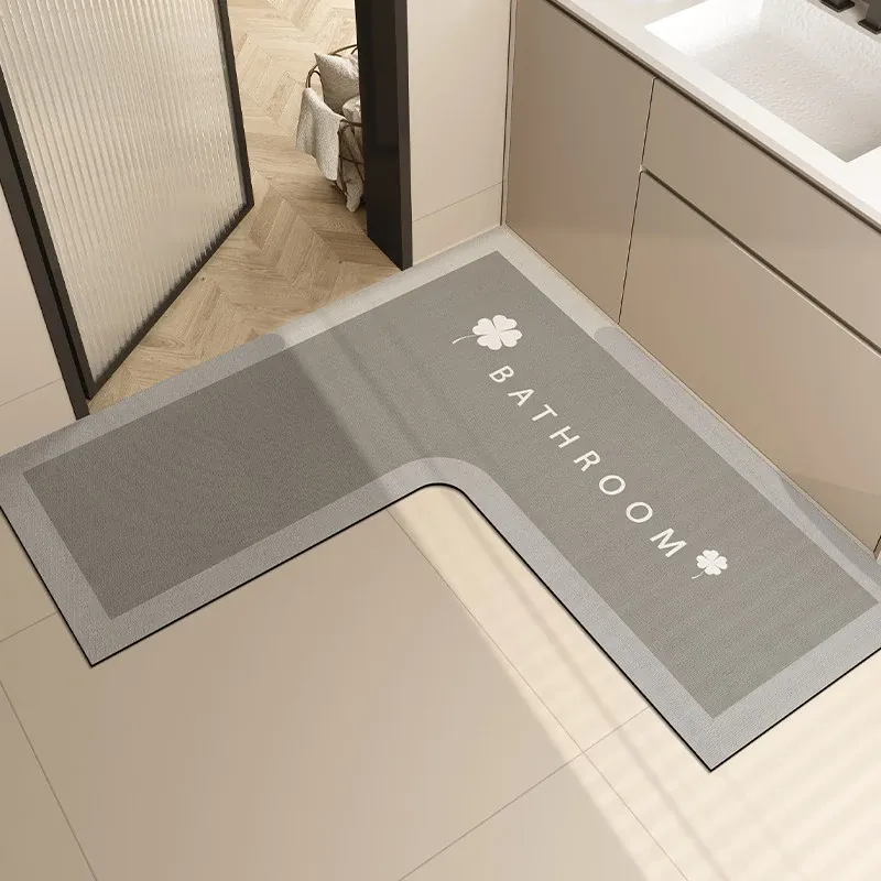 L型バスルームマット - 吸水性抜群で滑り止め効果も!トイレや洗面所の入り口に最適な柔らかいコーナーマット。清潔感あふれるデザインで、快適なバスタイムを演出します!