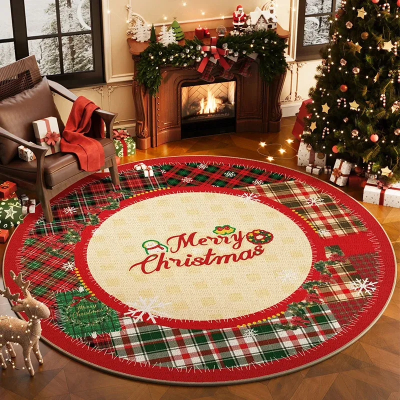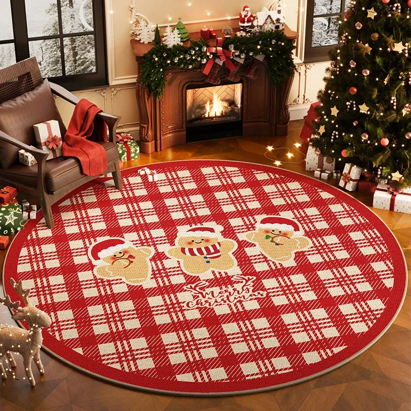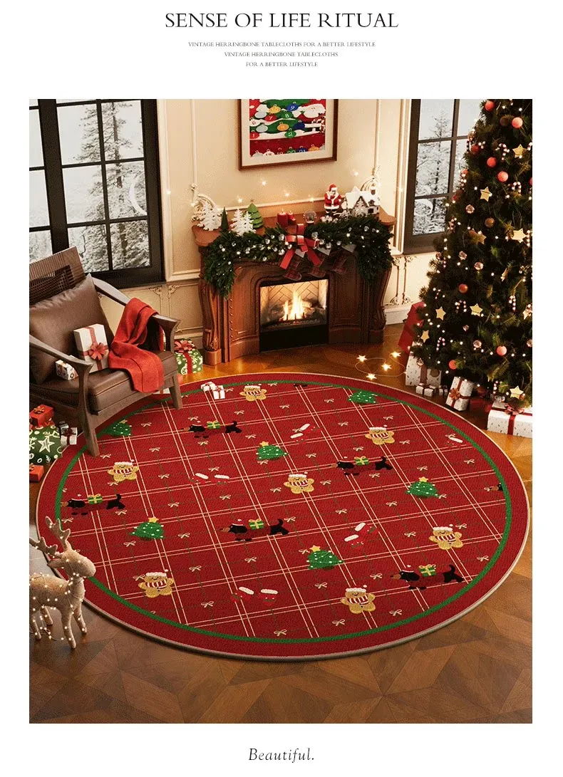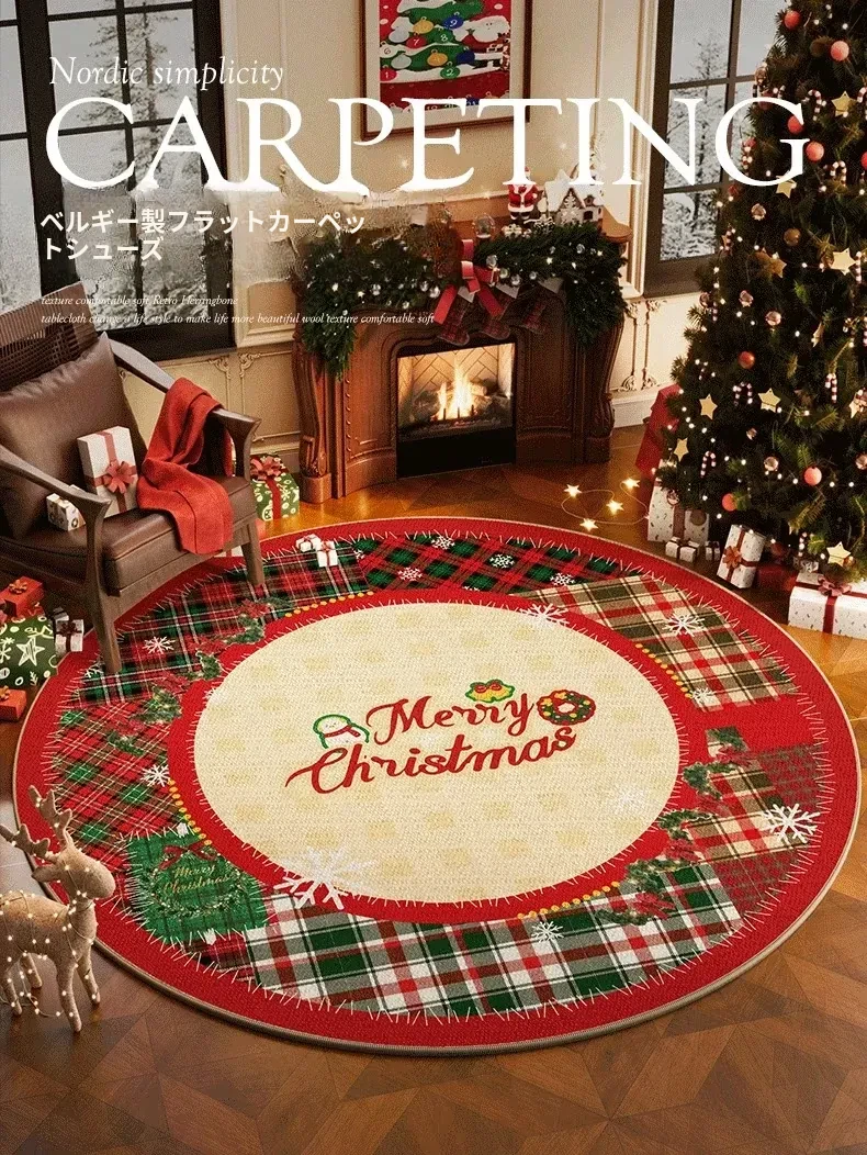 クリスマス風ラウンドカーペット 高級感漂うリビング用ホリデーデコレーションマット お祝いの赤色クリスマスツリー下用フロアマット