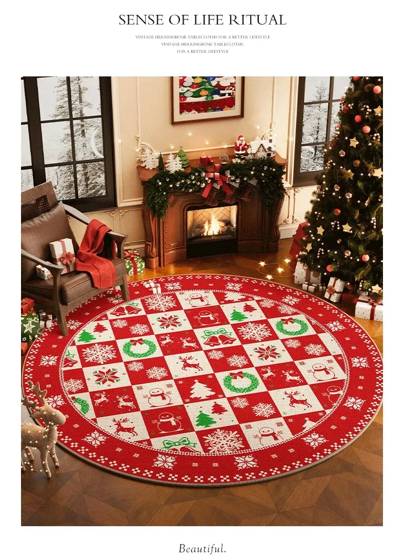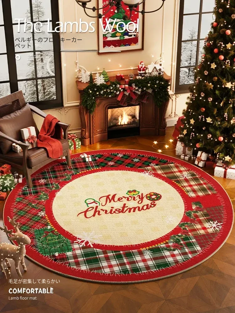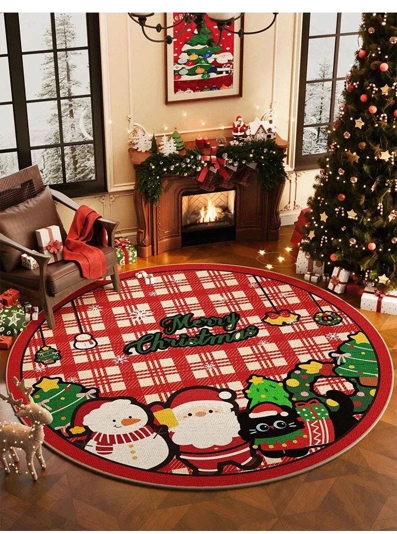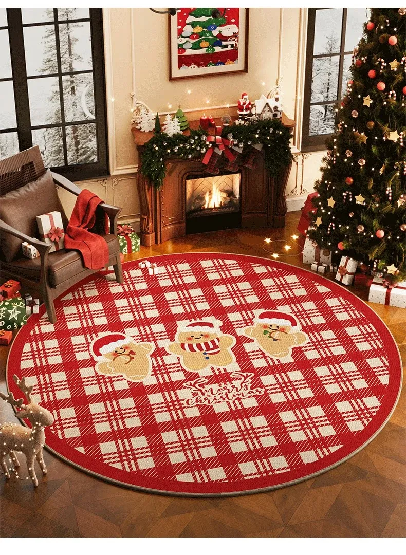 クリスマス風ラウンドカーペット 高級感漂うリビング用ホリデーデコレーションマット お祝いの赤色クリスマスツリー下用フロアマット