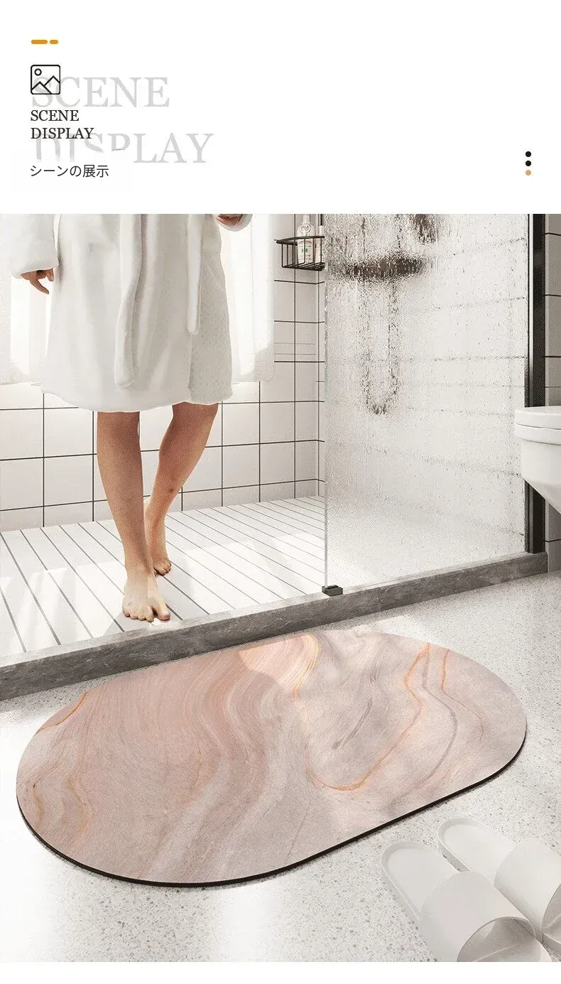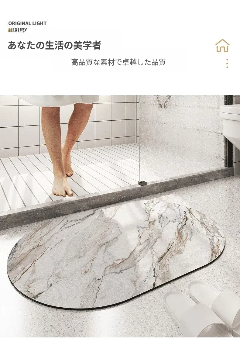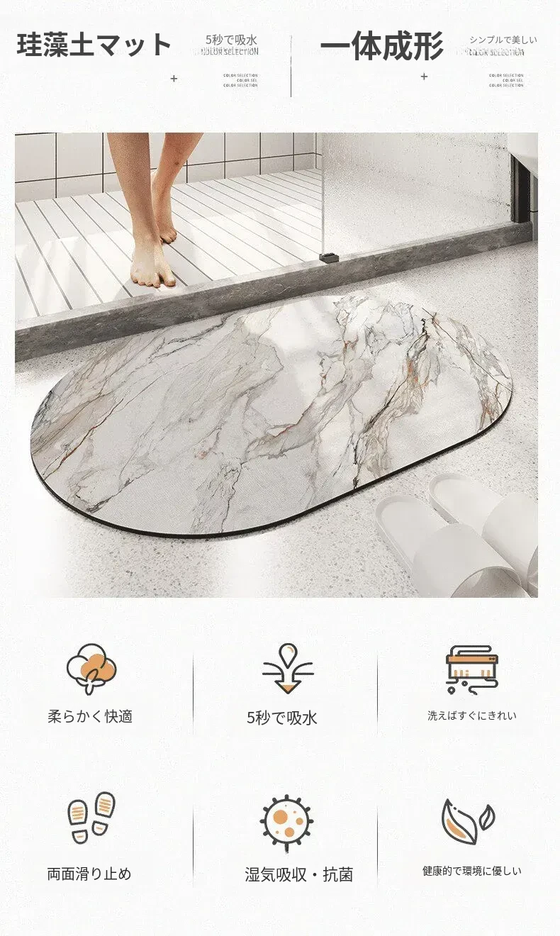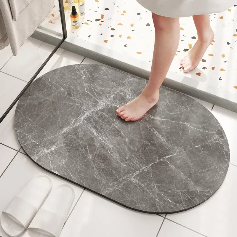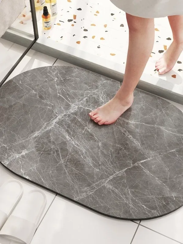大理石模様のバスルーム用マット - 吸水性抜群、滑り止め付きのソフトなシリカゲル素材。エレガントな楕円形デザインで、トイレの入口を華やかに演出!快適な足元を実現します。