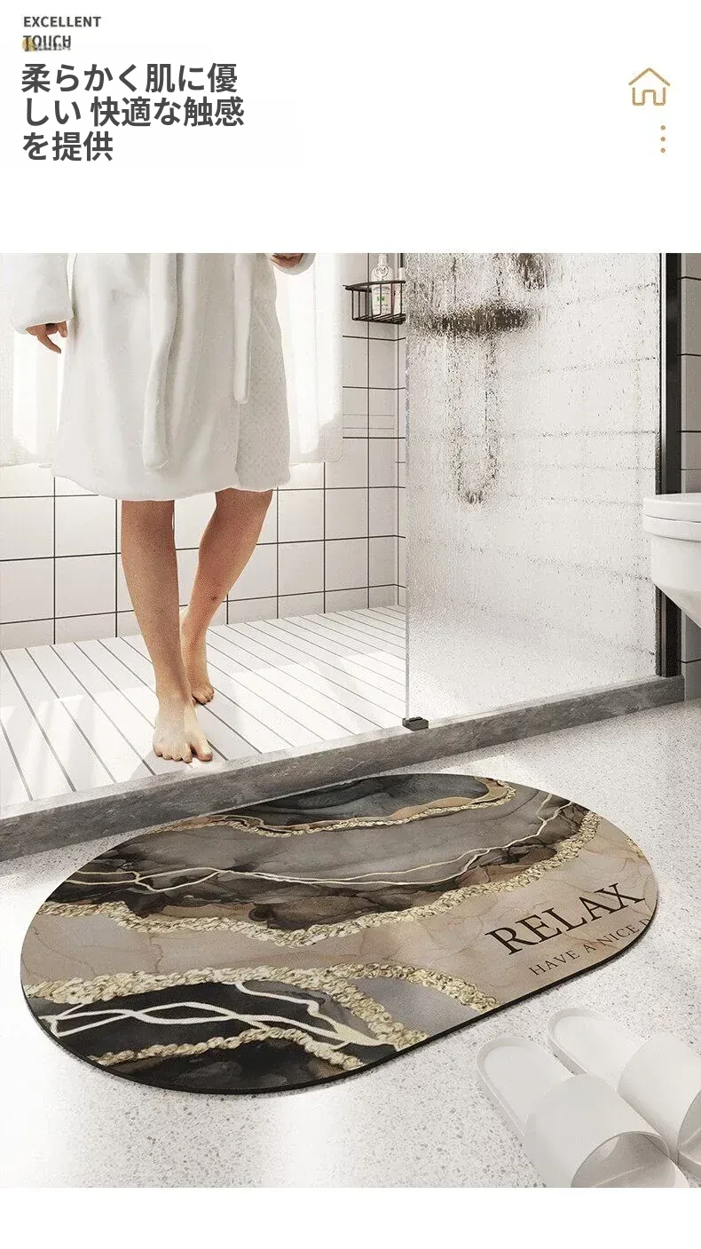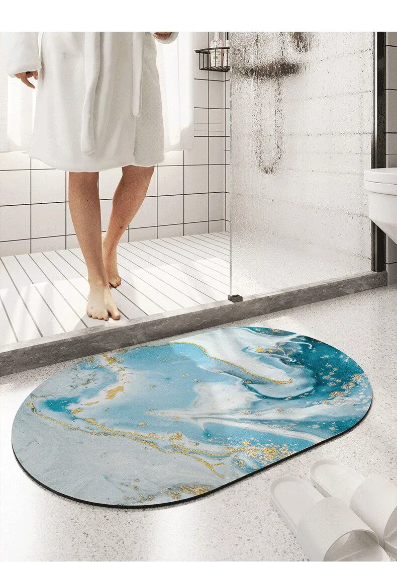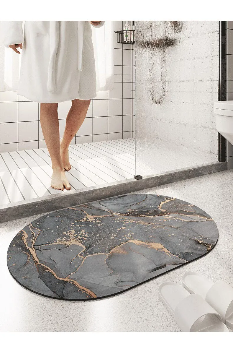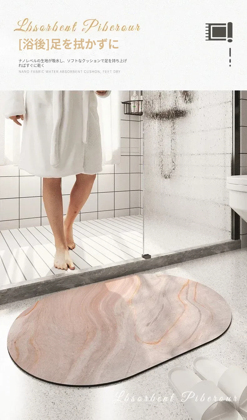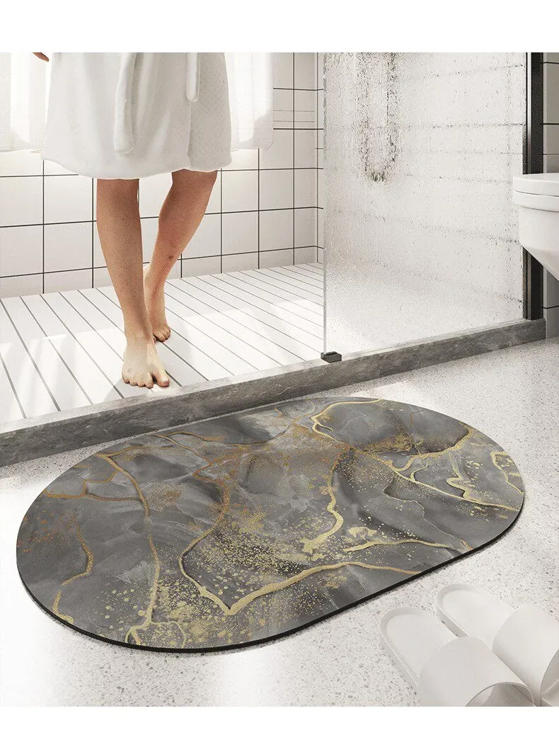 大理石模様のバスルーム用マット - 吸水性抜群、滑り止め付きのソフトなシリカゲル素材。エレガントな楕円形デザインで、トイレの入口を華やかに演出!快適な足元を実現します。
