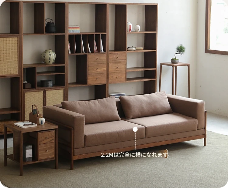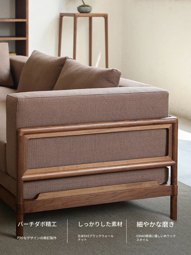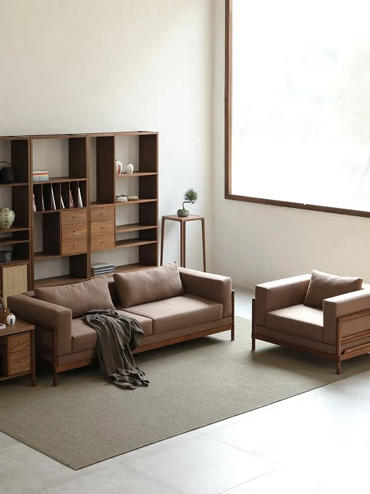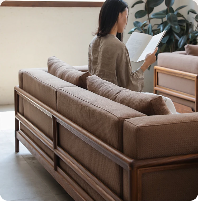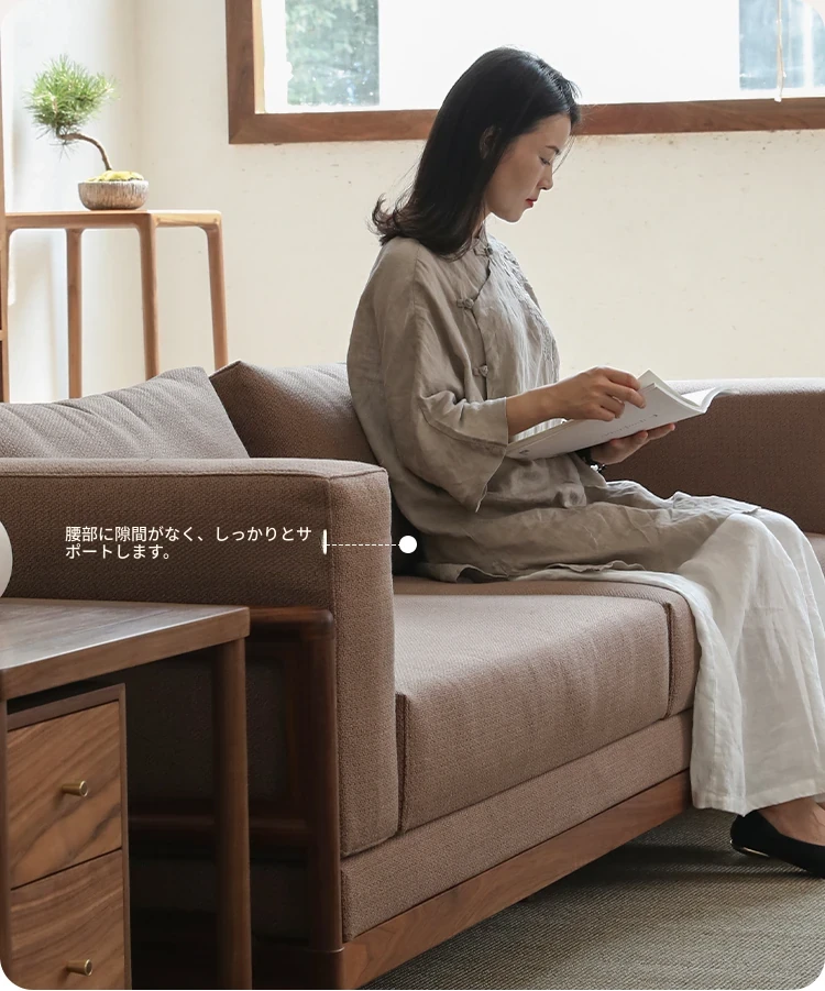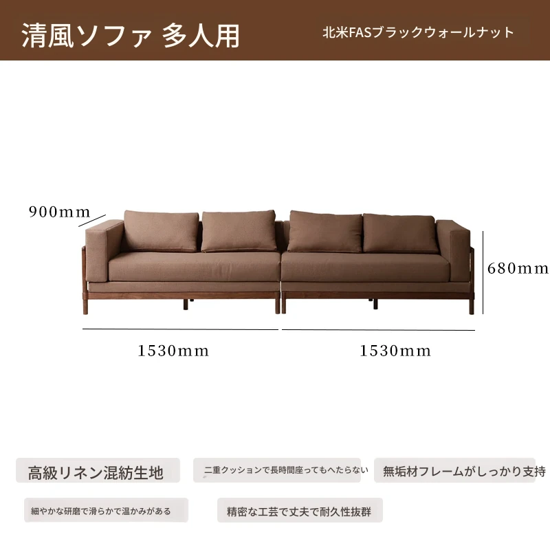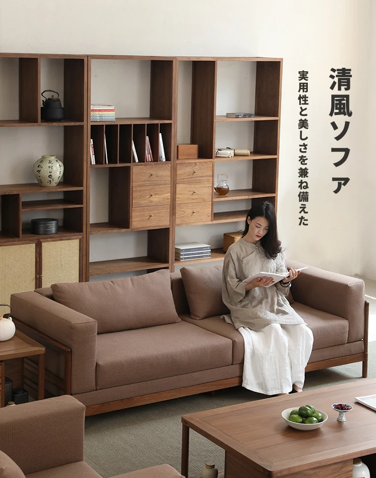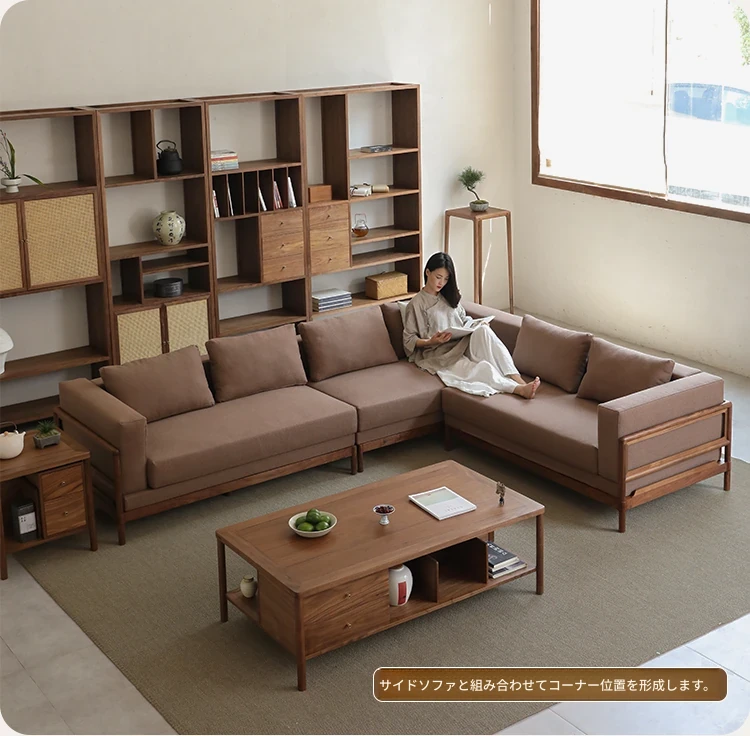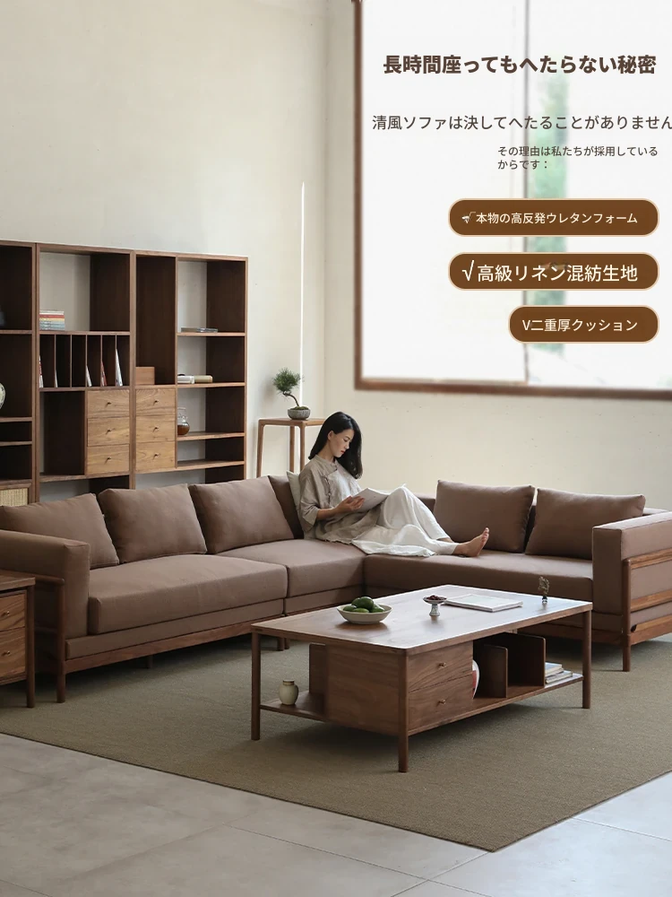 新中式スタイルの多人数用ソファ、ブラックウォールナット無垢材使用。モダンでシンプルなデザインの布張りコーナー・フェイスタイプの組み合わせ家具で、リビングにぴったりの洗練された選択!