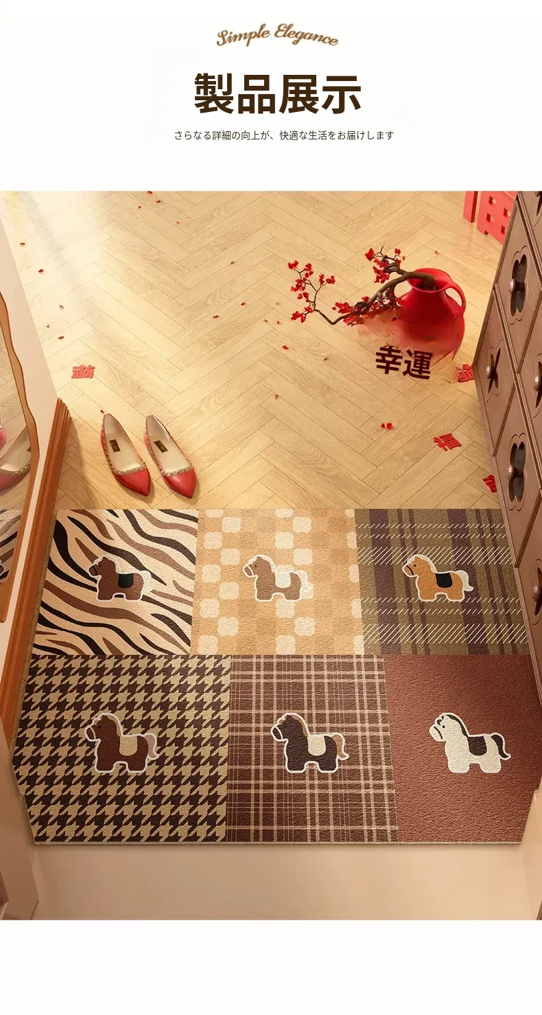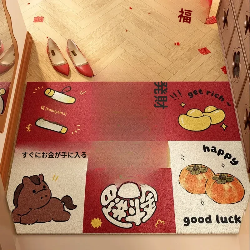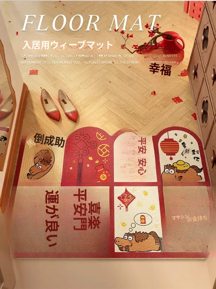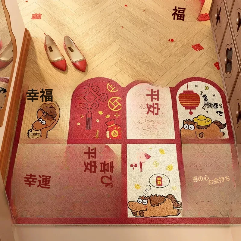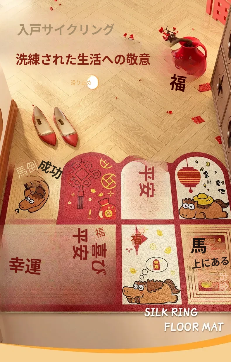 新年を迎える小さな馬の赤いカーペット!カット可能なマイクロファイバーで、入口にぴったりフィット。家庭用の滑り止め玄関マットで、安全におしゃれな空間を演出します。