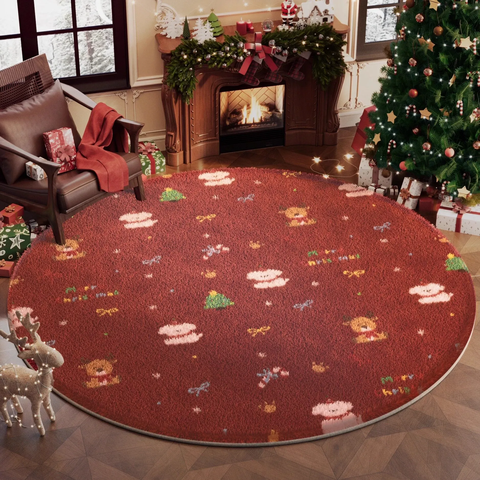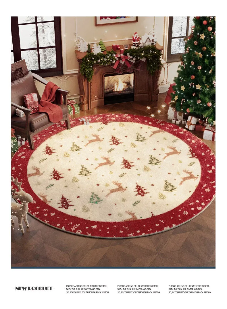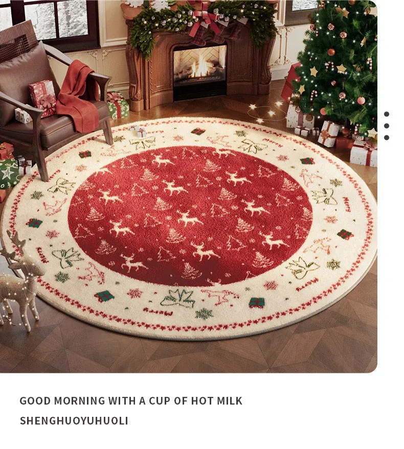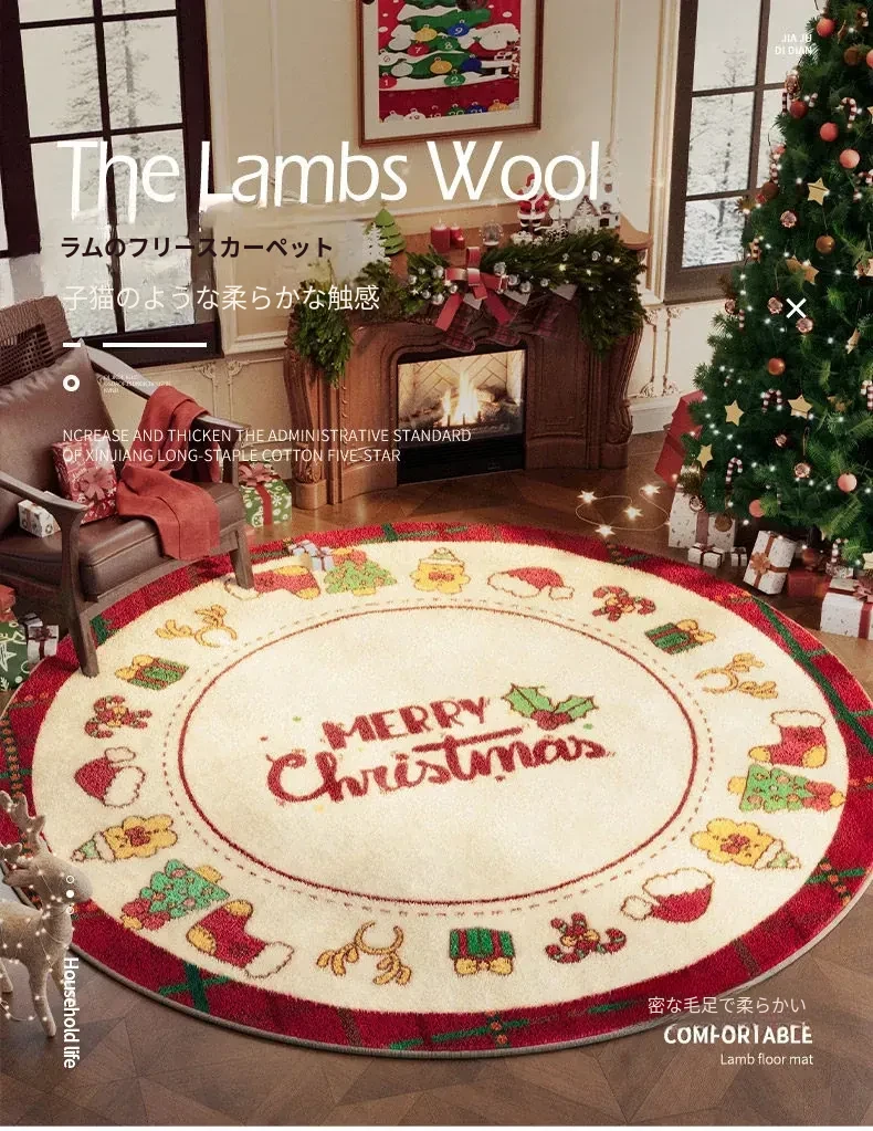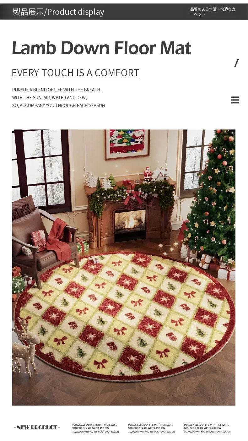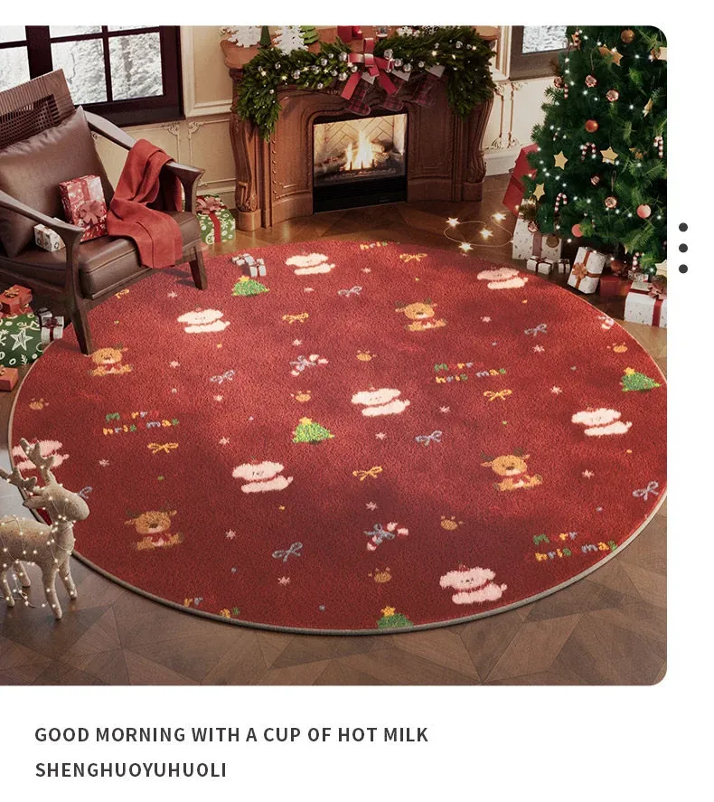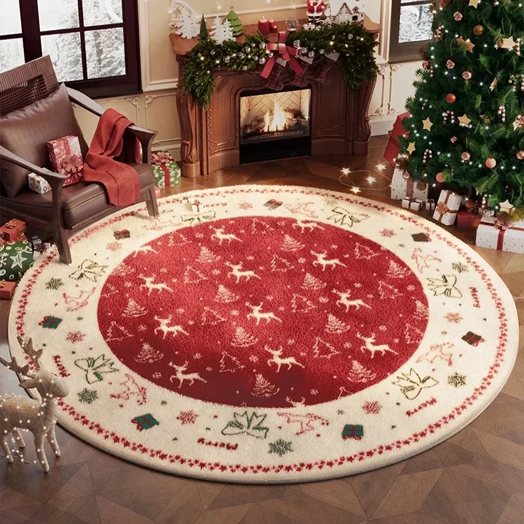 新年用のラウンドレッドカーペット!おしゃれなソファや椅子にぴったりの厚手フワフワマット。お部屋を明るく彩る装飾アイテムとして、贈り物にも最適です!
