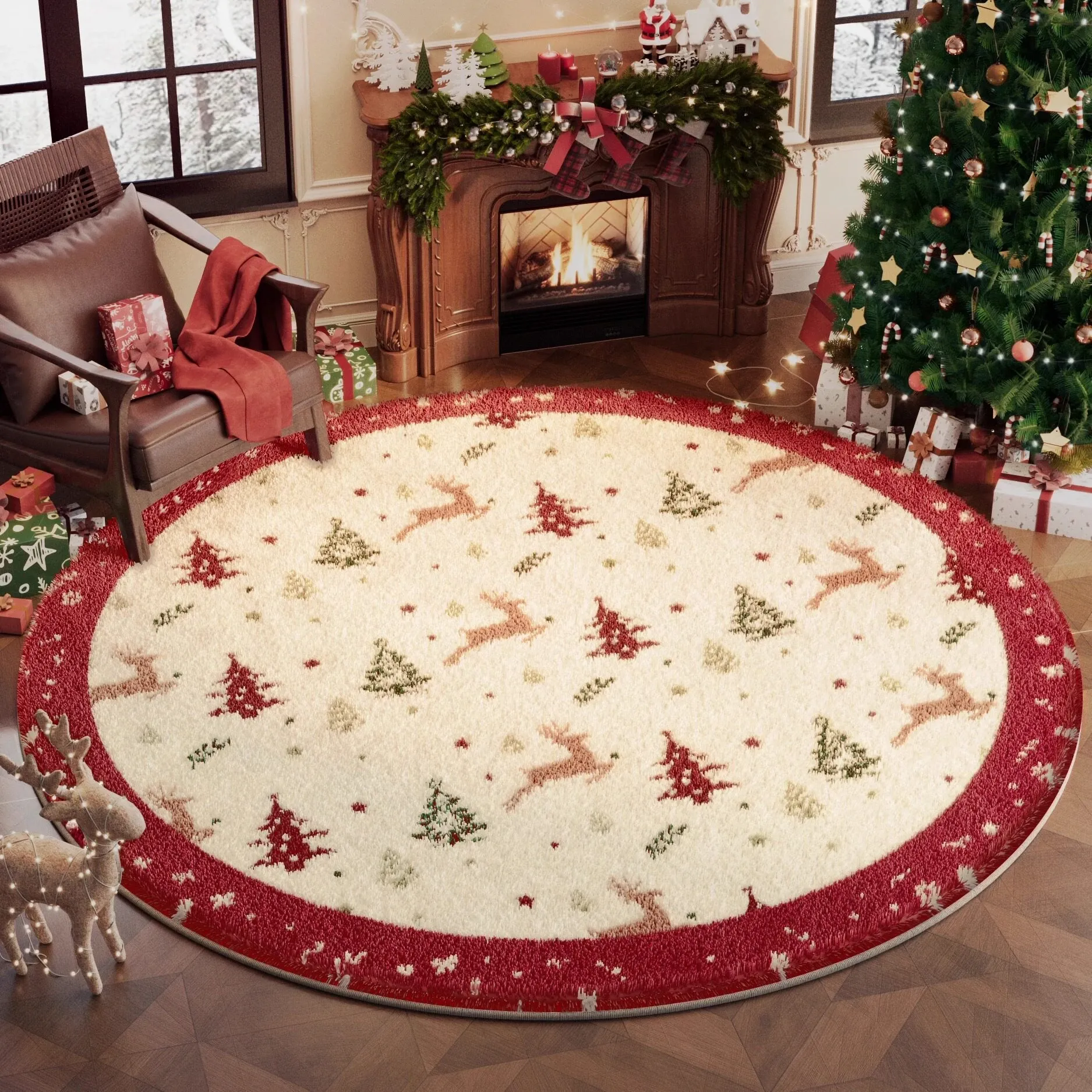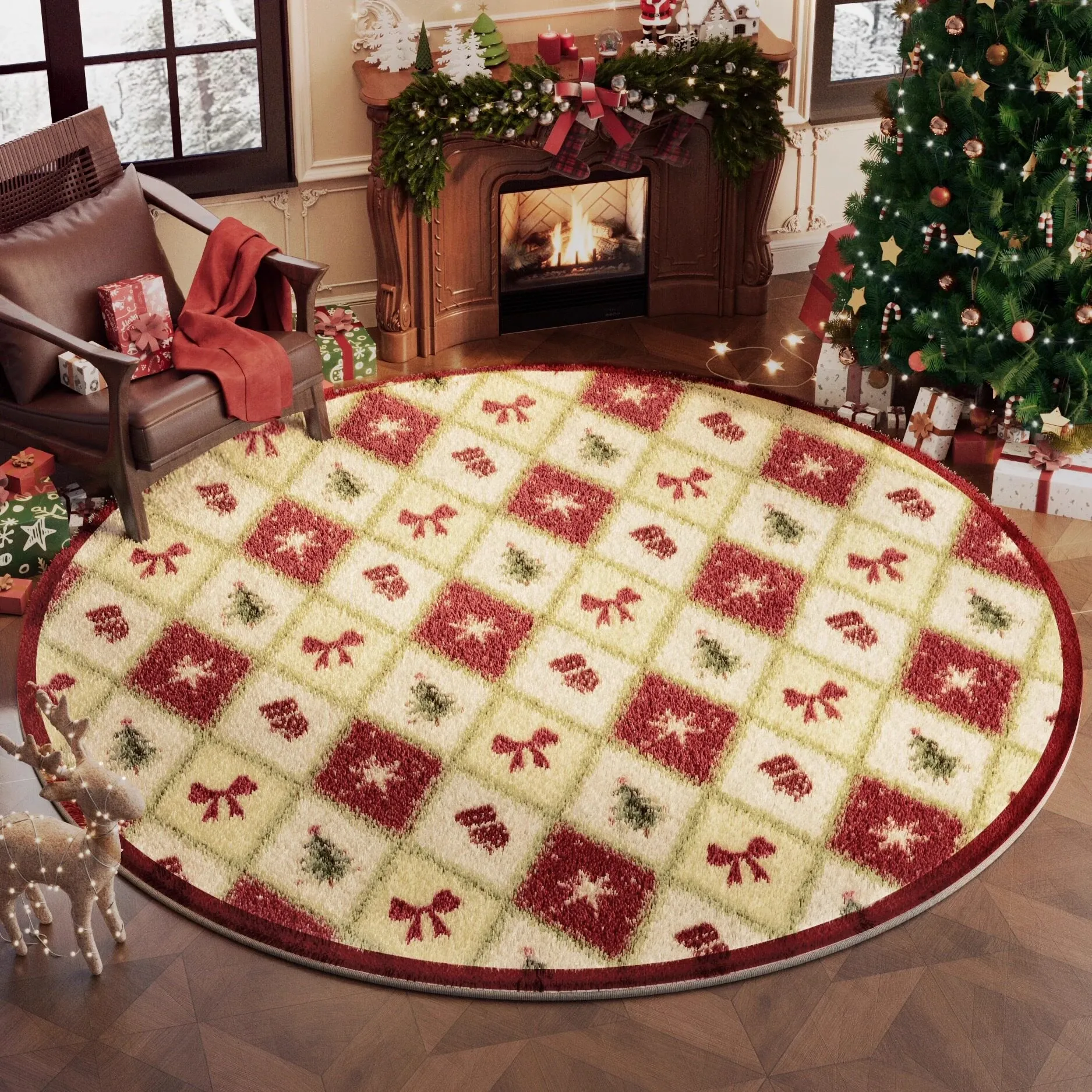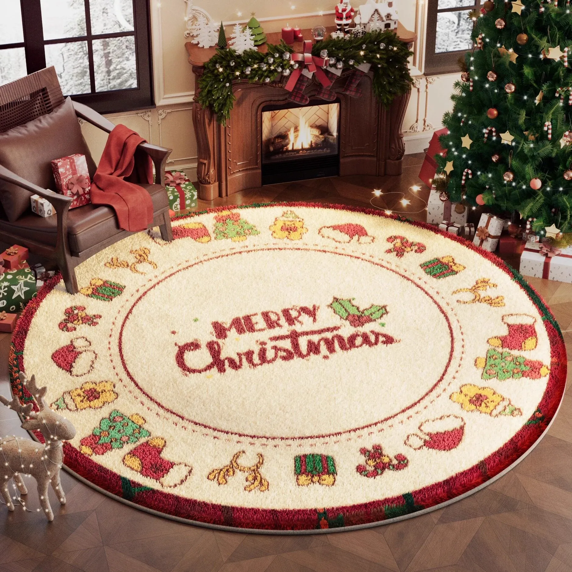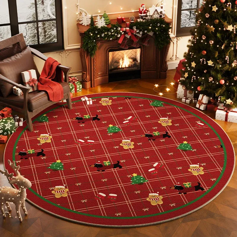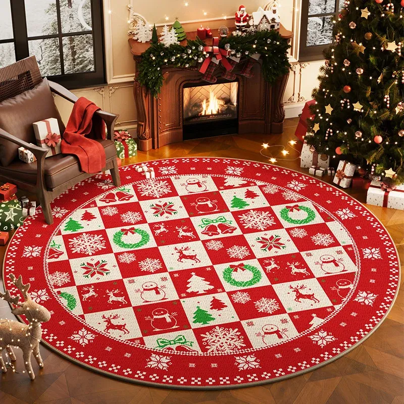 新年用のラウンドレッドカーペット!おしゃれなソファや椅子にぴったりの厚手フワフワマット。お部屋を明るく彩る装飾アイテムとして、贈り物にも最適です!
