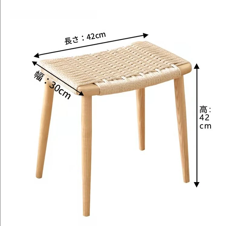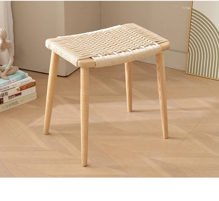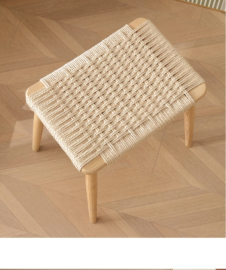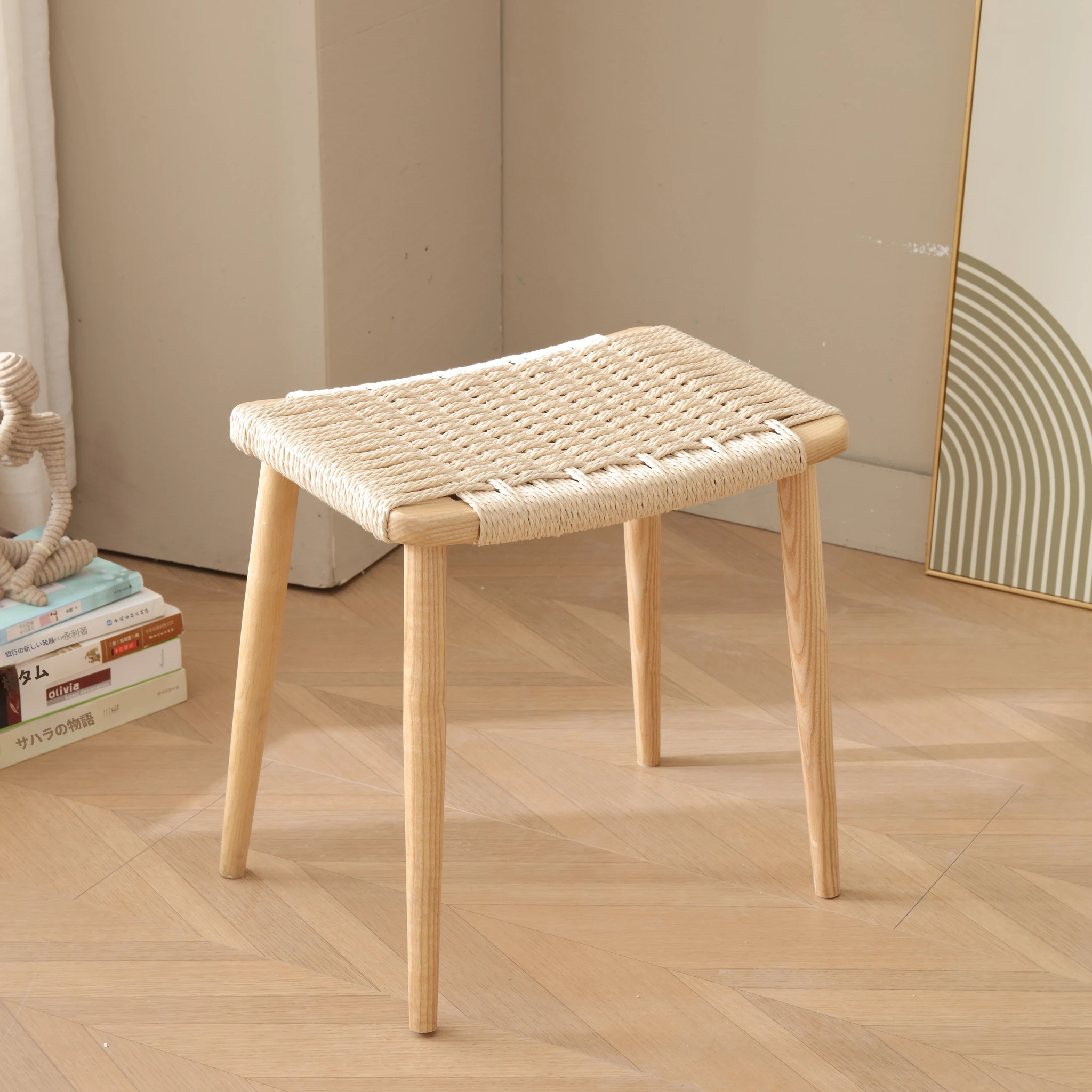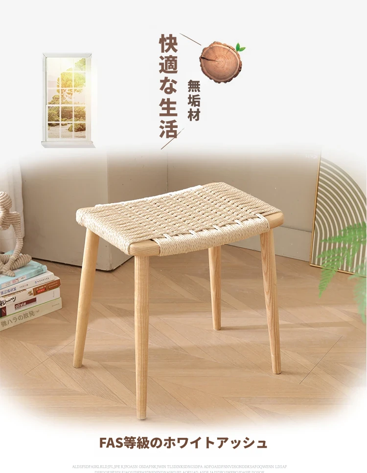 北欧風ホワイトアッシュロープ編み化粧台ベンチ - シンプルでスタイリッシュなデザイン、寝室や玄関での靴替えにも最適!天然木のアート感あふれる実木製スクエアベンチ。