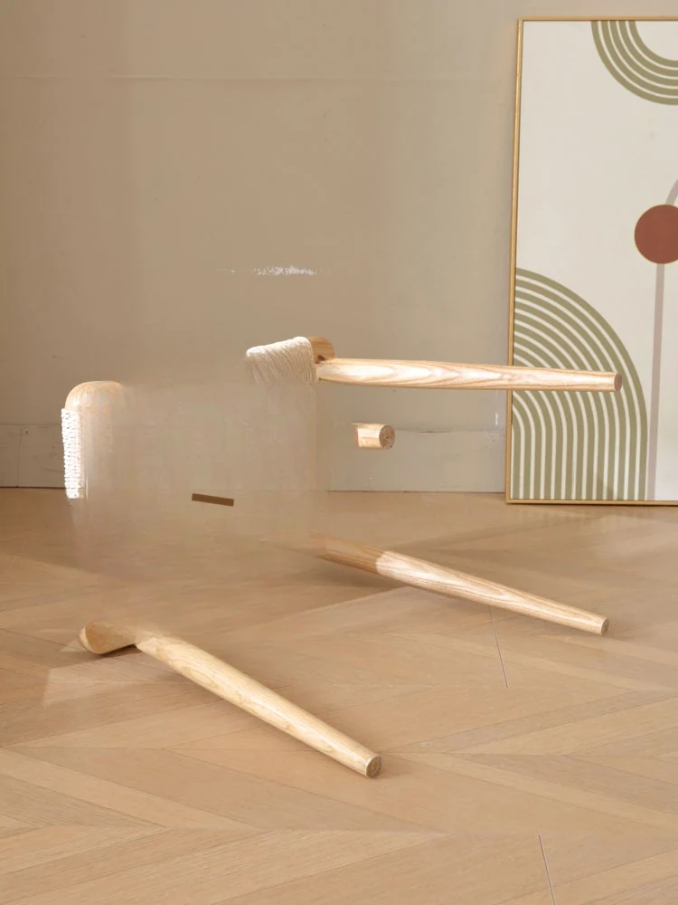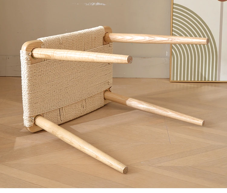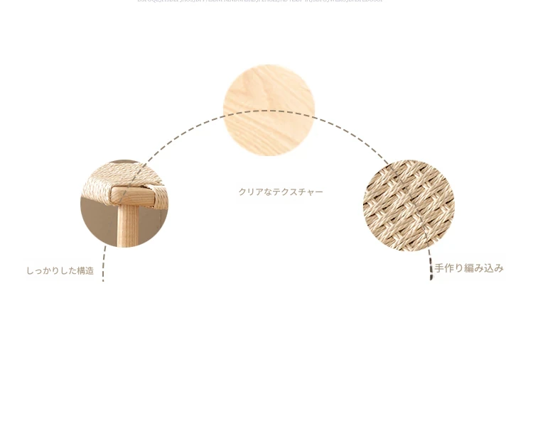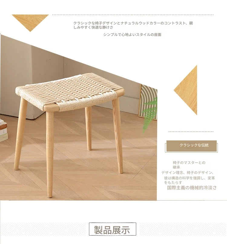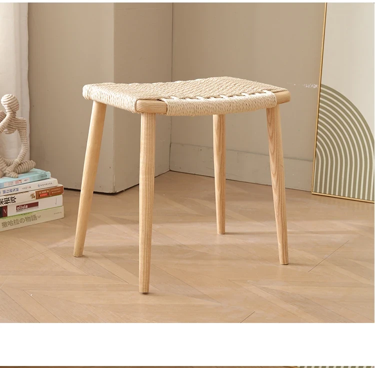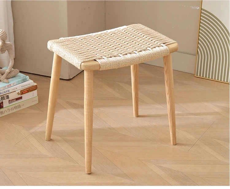 北欧風ホワイトアッシュロープ編み化粧台ベンチ - シンプルでスタイリッシュなデザイン、寝室や玄関での靴替えにも最適!天然木のアート感あふれる実木製スクエアベンチ。