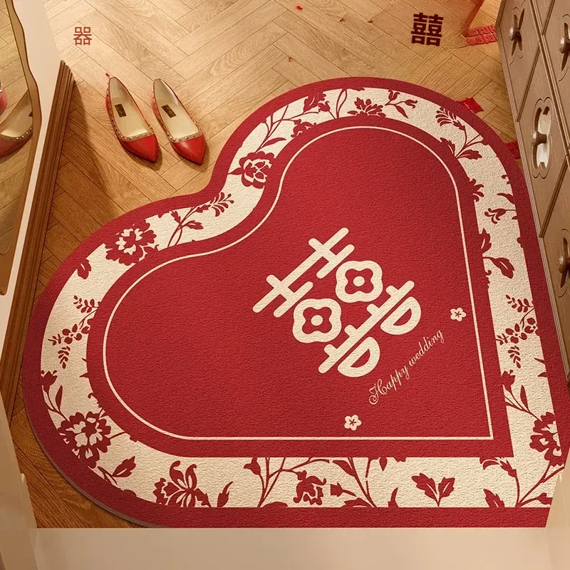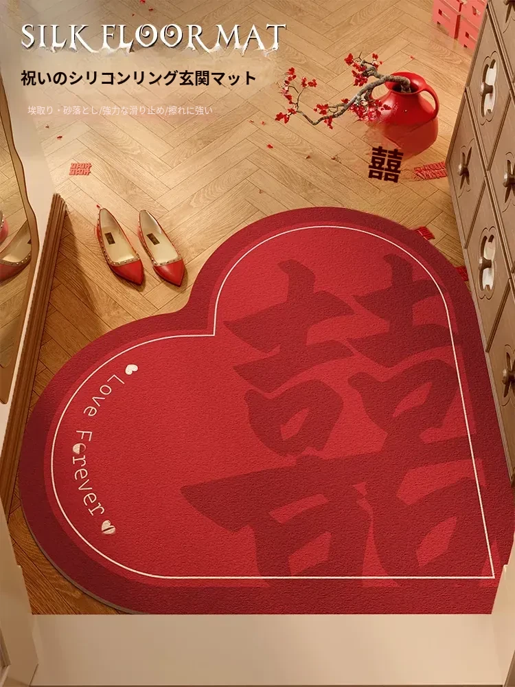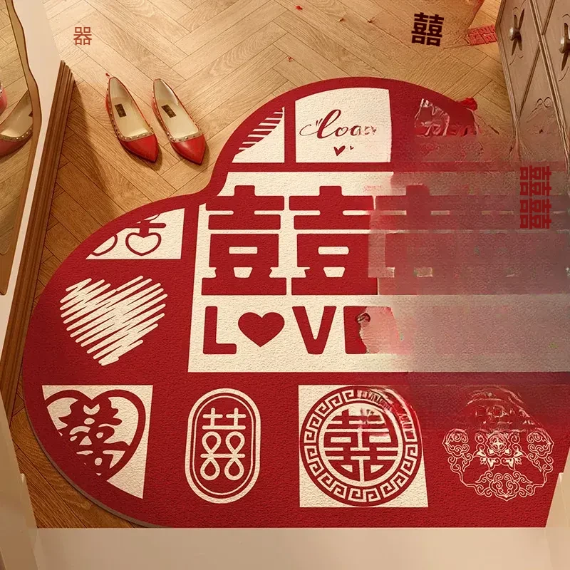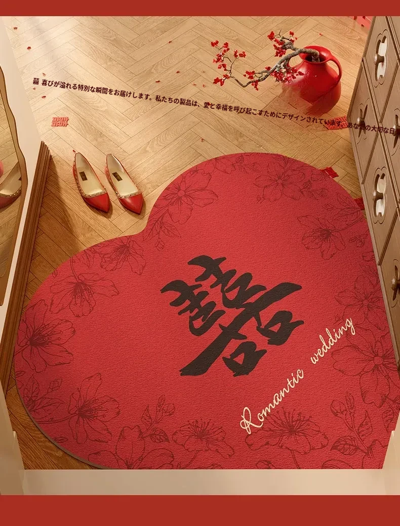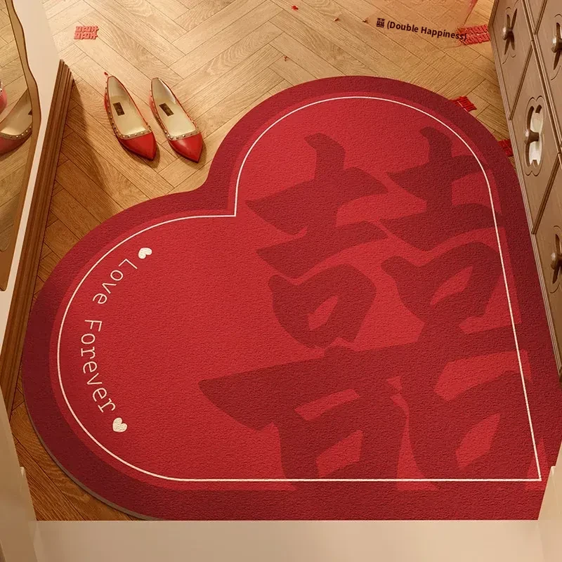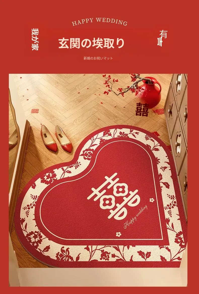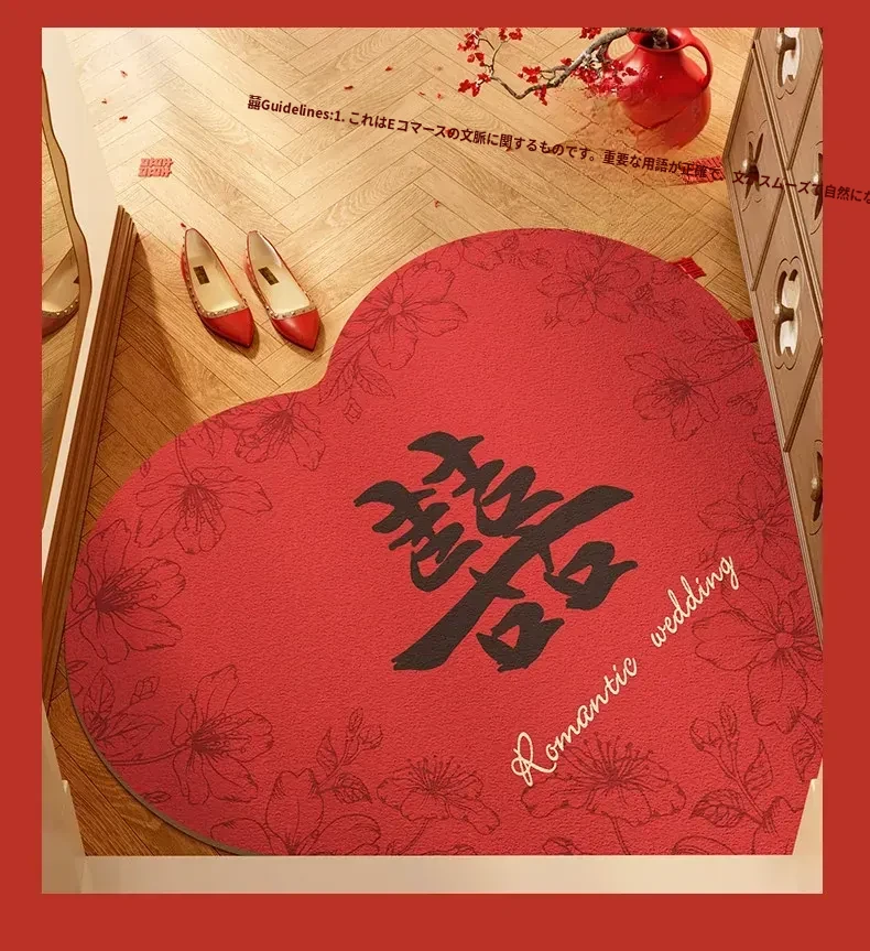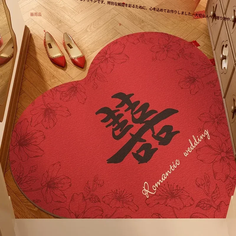 ハート型の結婚用玄関マット - 高級感あふれる新婚家庭にぴったり!喜びの字が描かれた赤いカーペットは、寝室やエントランスに最適な足元のアクセントです。