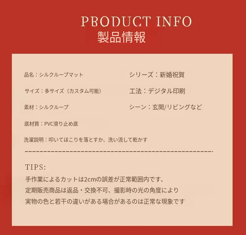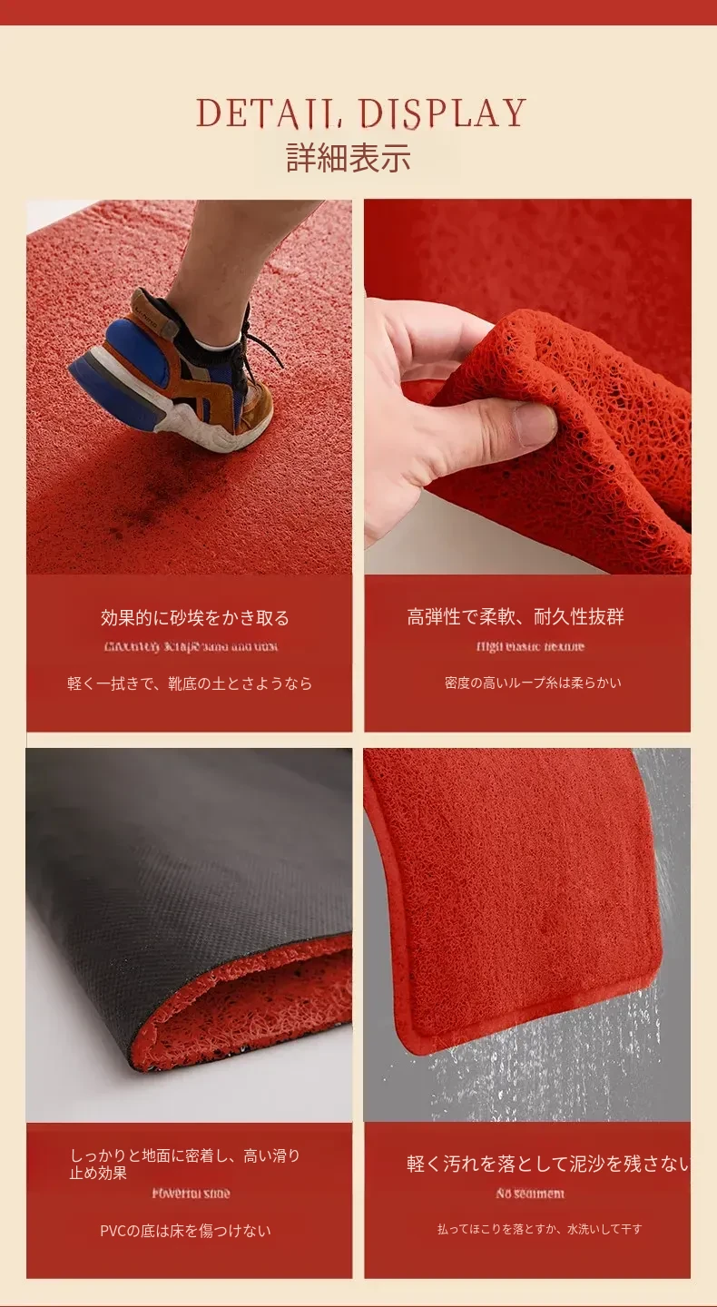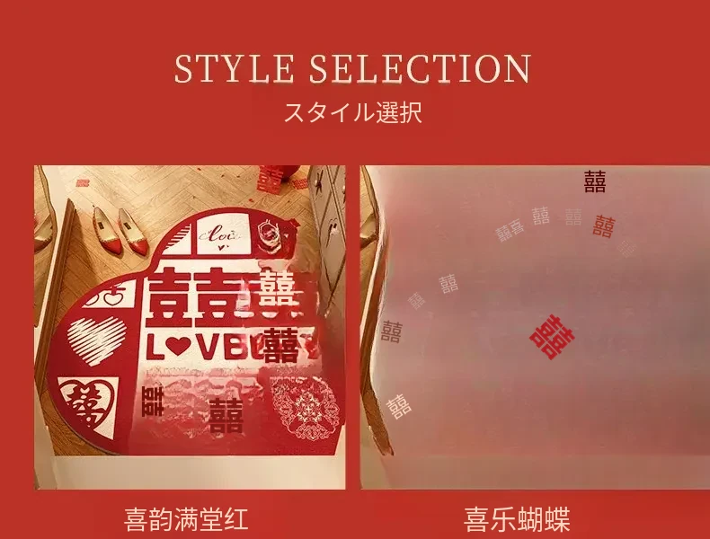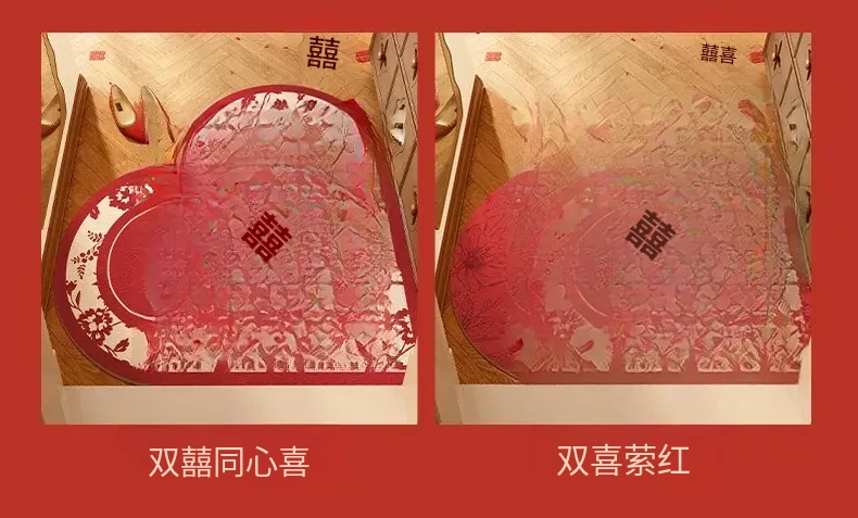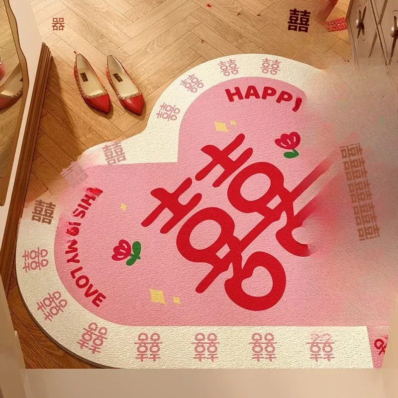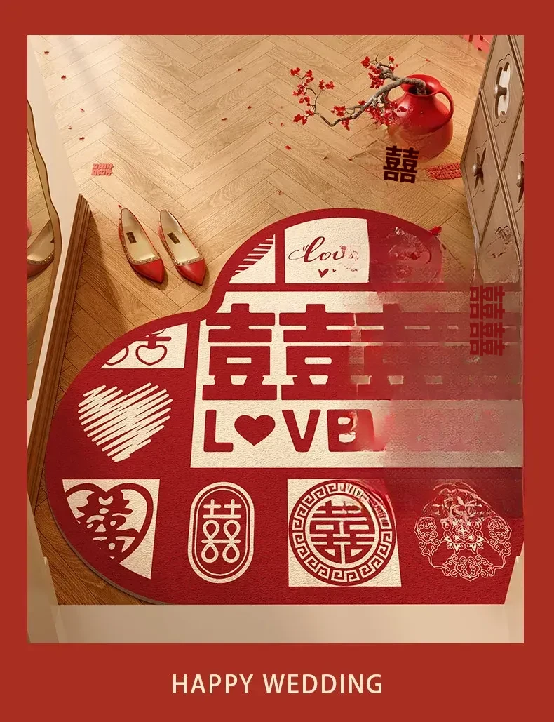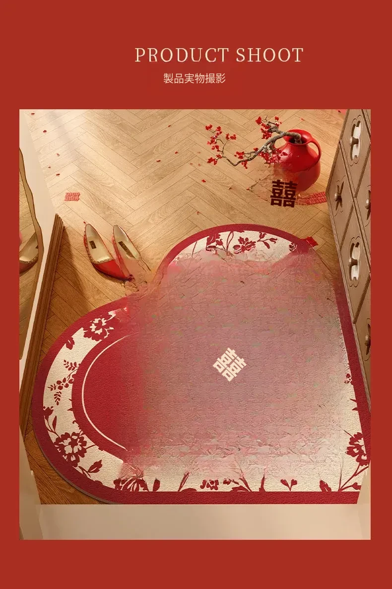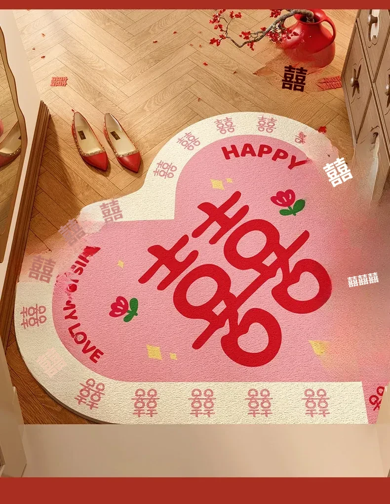 ハート型の結婚用玄関マット - 高級感あふれる新婚家庭にぴったり!喜びの字が描かれた赤いカーペットは、寝室やエントランスに最適な足元のアクセントです。