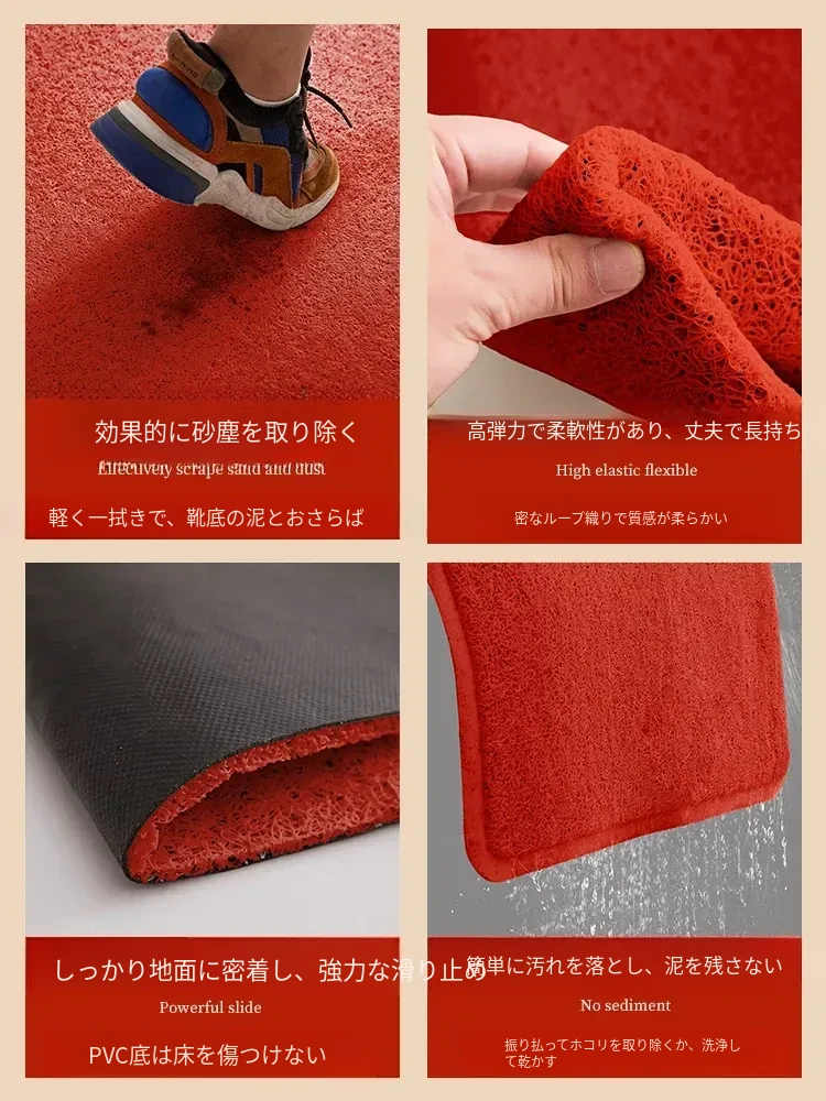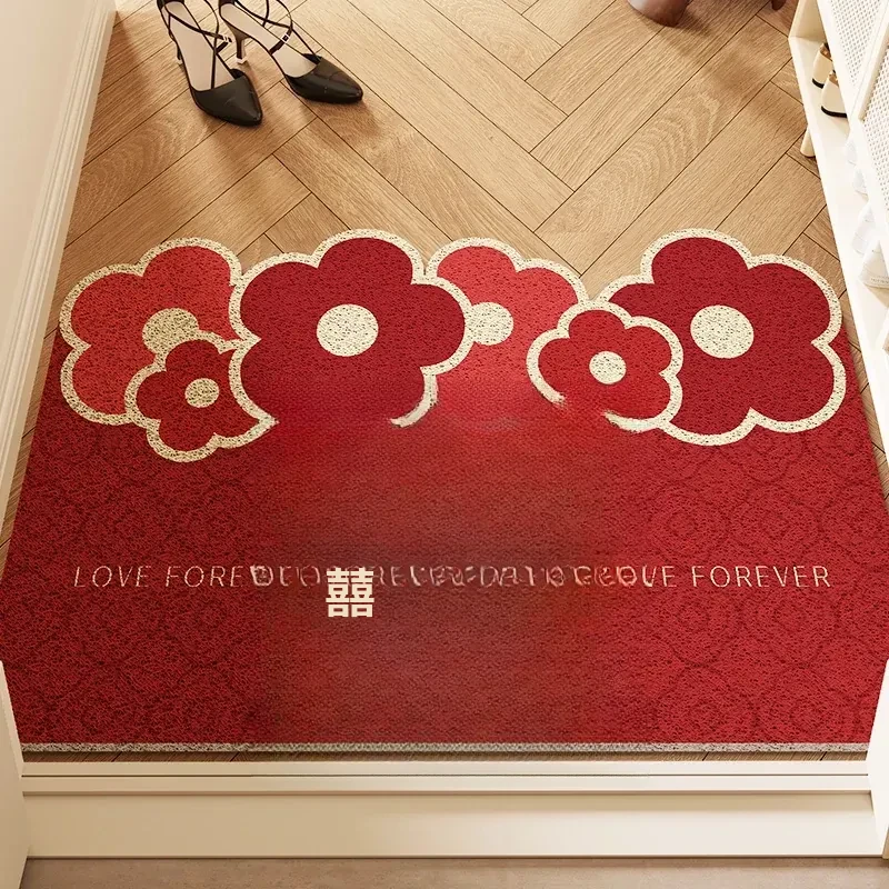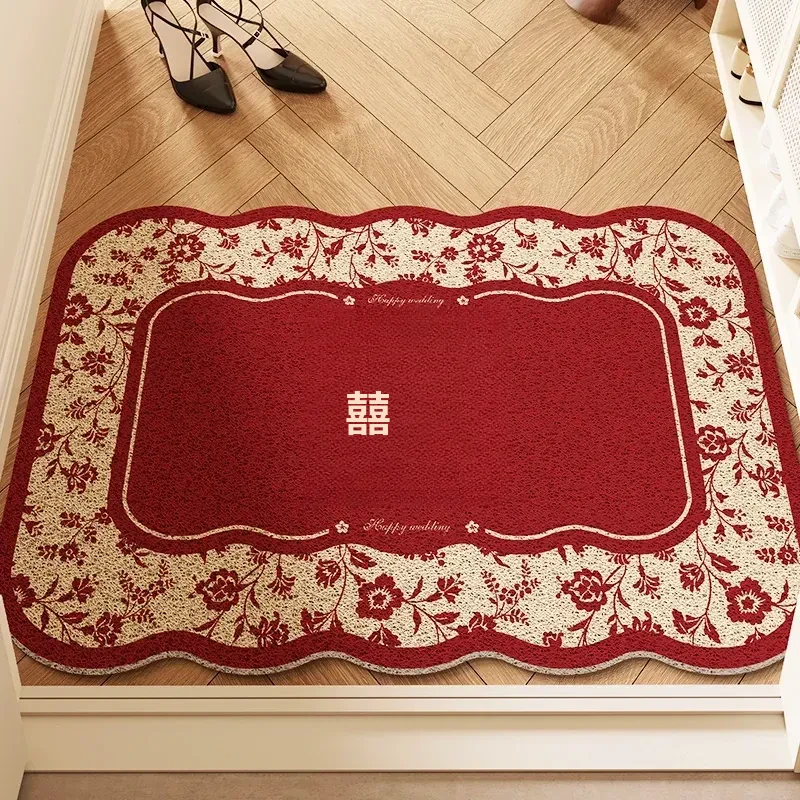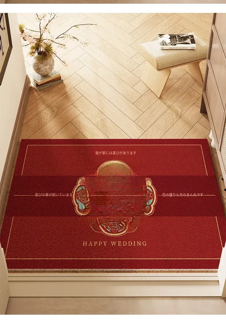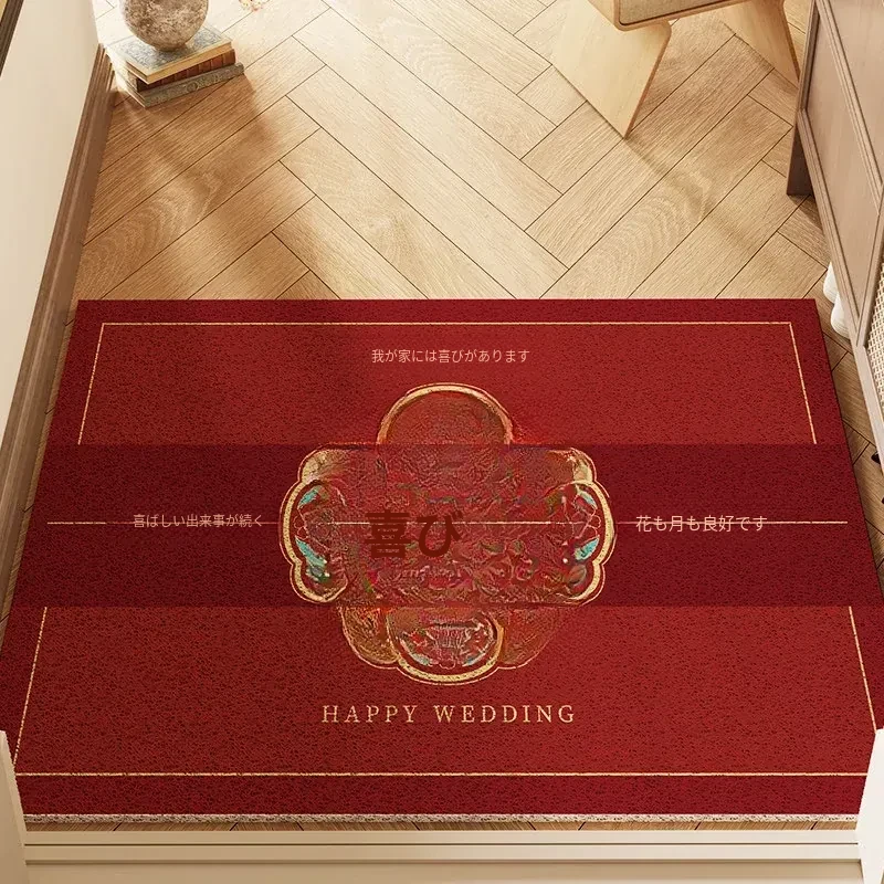結婚祝いにぴったり!赤い喜字デザインの玄関マット - 新婚生活を彩るスタイリッシュなループ足元マット。おしゃれで縁起の良いインテリアで、特別な日をさらに素敵に演出します!