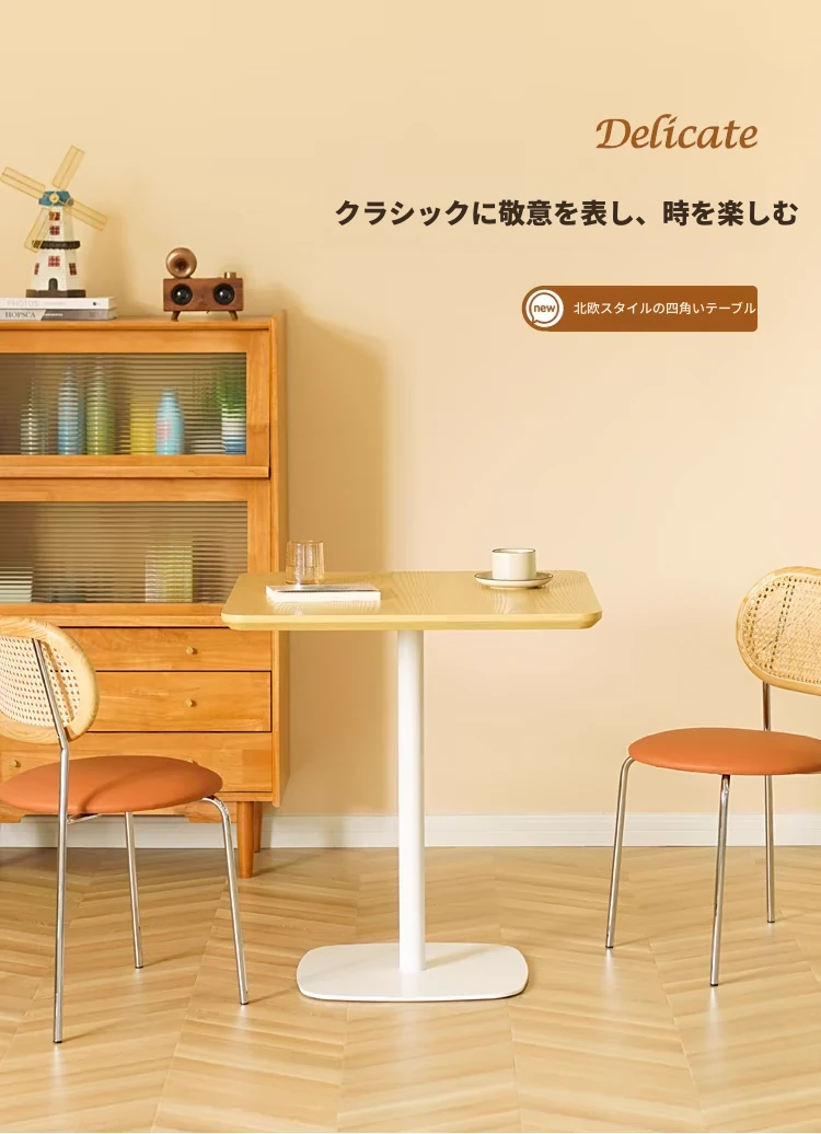 シンプルな無垢材のスクエアテーブル | 商業用カフェテーブル | ミルクティー店やスイーツ店に最適 | 会議やイベントにも対応 | 人気のインスタ映えデザイン | おしゃれで機能的な接客テーブル