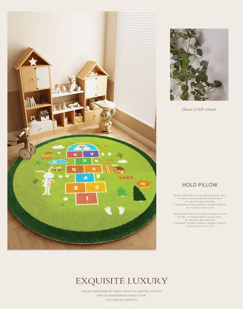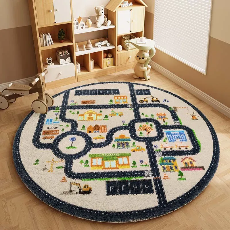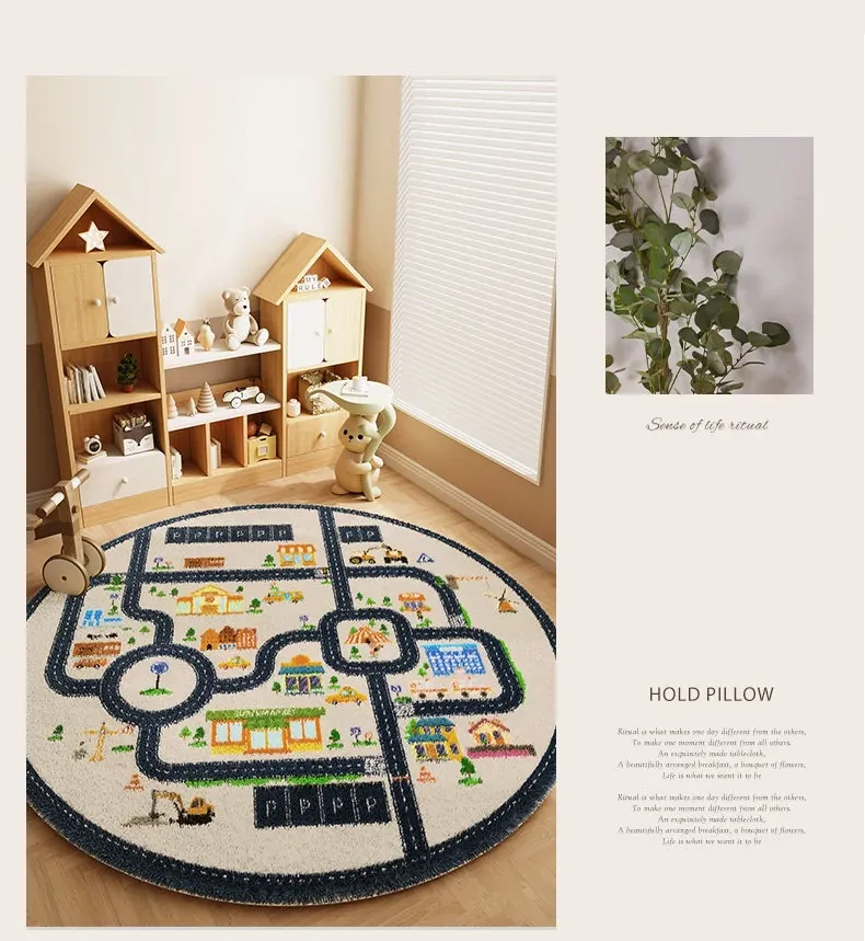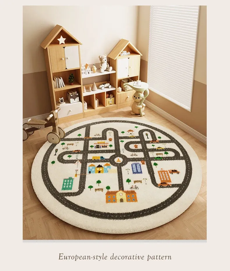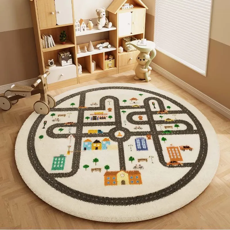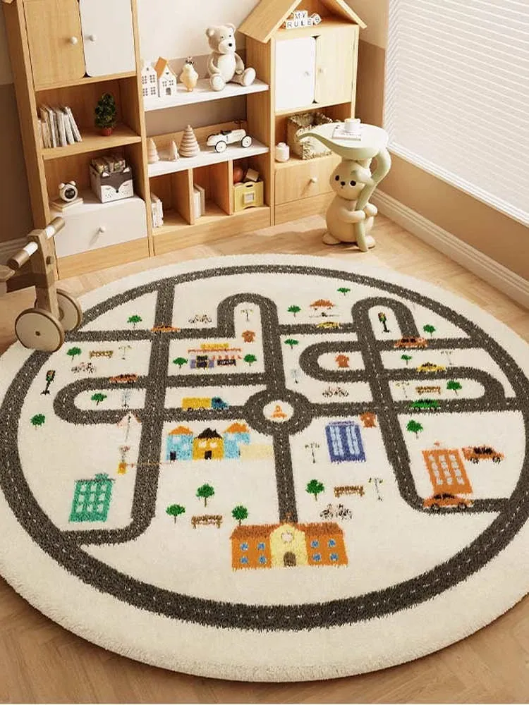 冬季にぴったり!お子様のためのかわいい駐車場デザインのラウンドシープフリースマット。読書スペースにも最適!衝撃吸収機能付きで安全、手入れも簡単。心地よい揺り椅子マットで、楽しい時間を提供します。